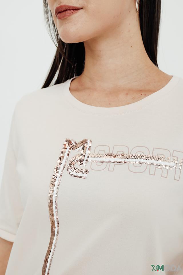 Футболка имеет классический крой с круглым вырезом горловины и короткими рукавами. Особенностью модели является декоративная надпись "SPORTS", выполненная с использованием блестящих элементов, что придает ей изысканный и современный вид.