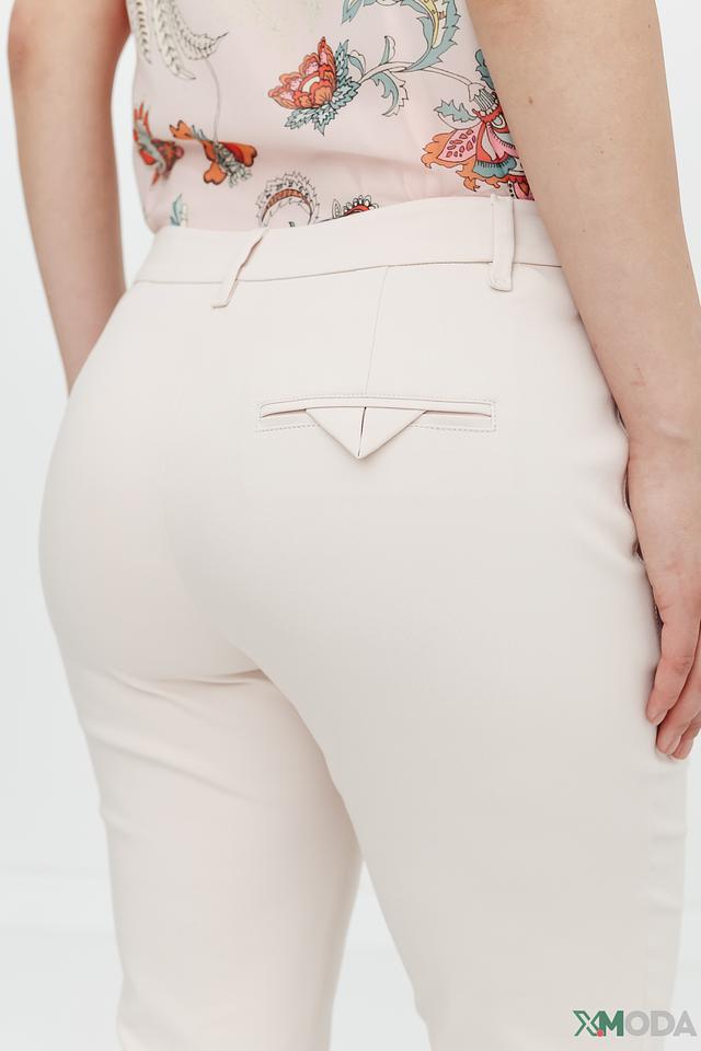 Брюки имеют классический крой с зауженными к низу штанинами, что визуально удлиняет ноги и придает силуэту изящество. Застежка на молнию и пуговицу, а также аккуратные боковые карманы добавляют функциональности.