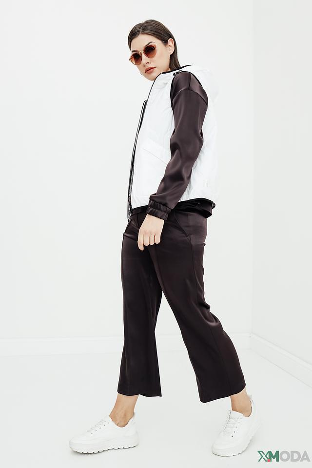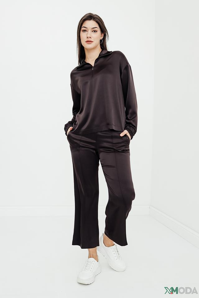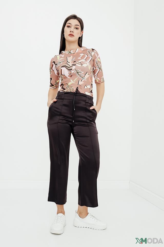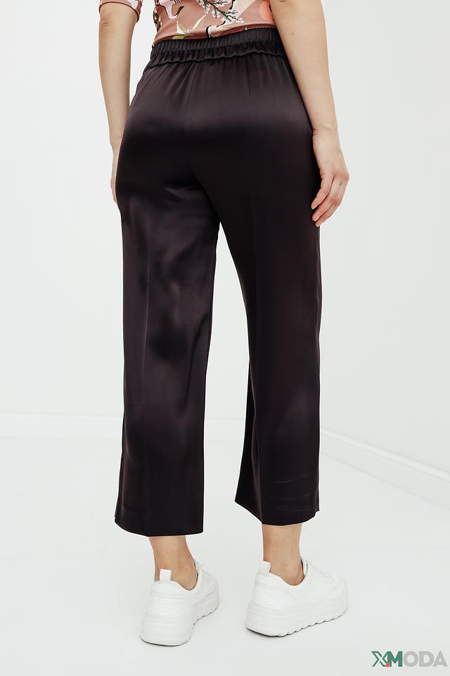 Брюки имеют завышенную талию с эластичной резинкой и шнурком для регулировки посадки. Ткань – сочетание триацетата и полиэстера – приятна на ощупь, хорошо держит форму и не требует сложного ухода.