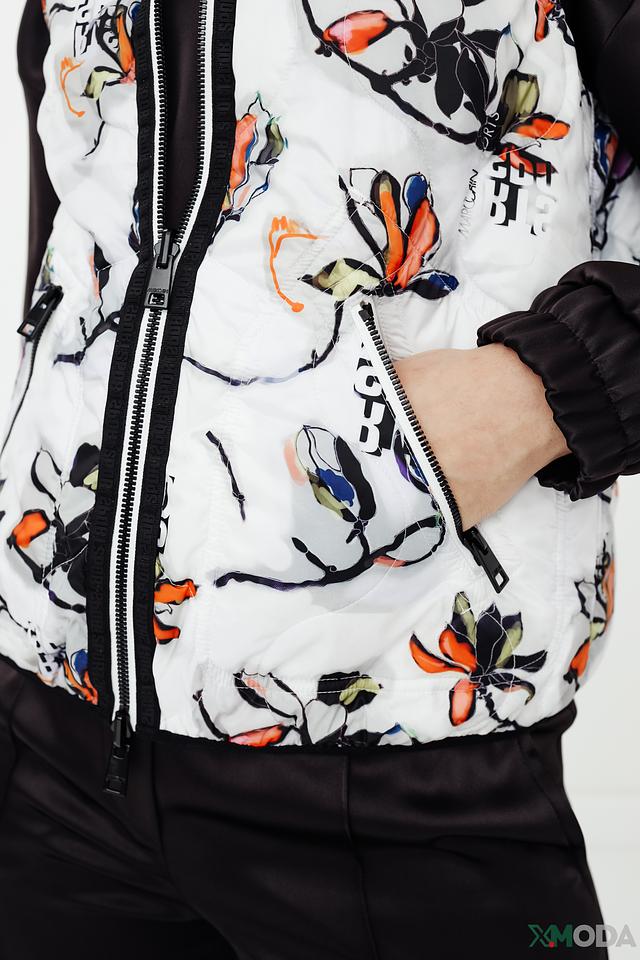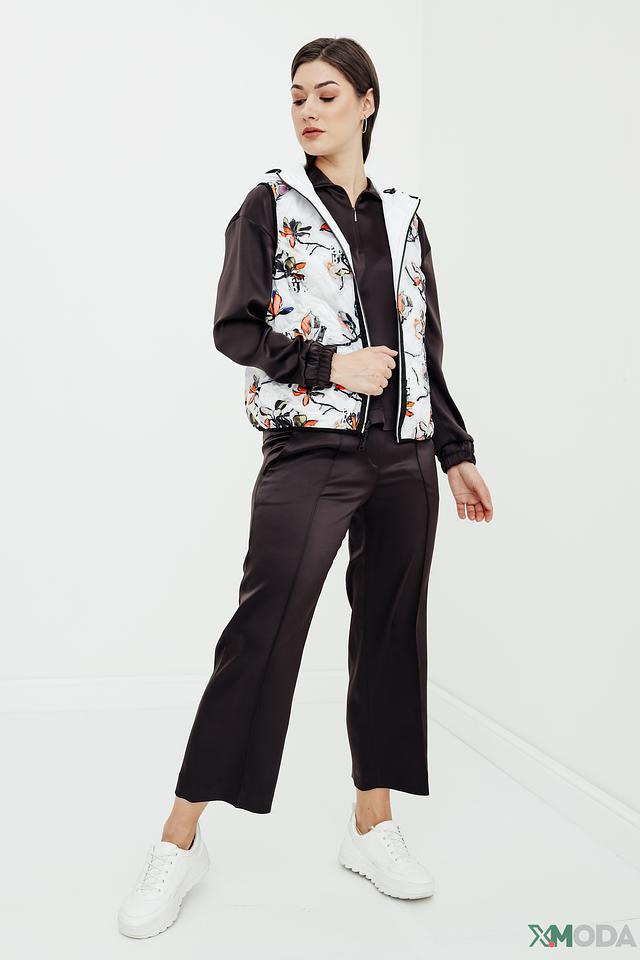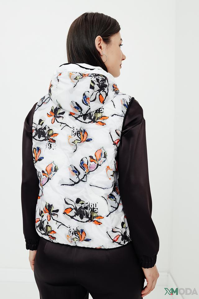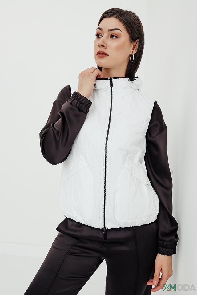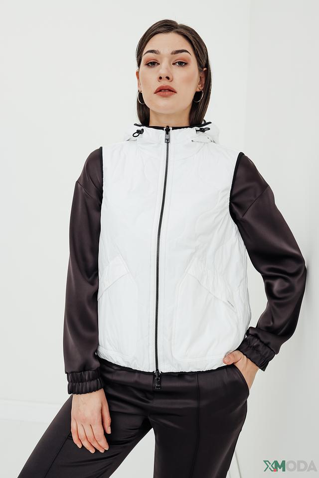 Модель имеет стеганую фактуру, капюшон и застёжку-молнию во всю длину. Рукава и часть переда выполнены из гладкой ткани, что добавляет динамики образу. Жилет отлично подойдет для прохладной погоды, обеспечивая тепло и свободу движений.