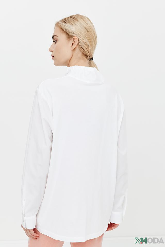 Блуза имеет свободный крой, длинные рукава с манжетами на пуговицах и классический отложной воротник. Застежка на пуговицах по всей длине переда. Рукава слегка спущены, что добавляет образу непринужденности.
