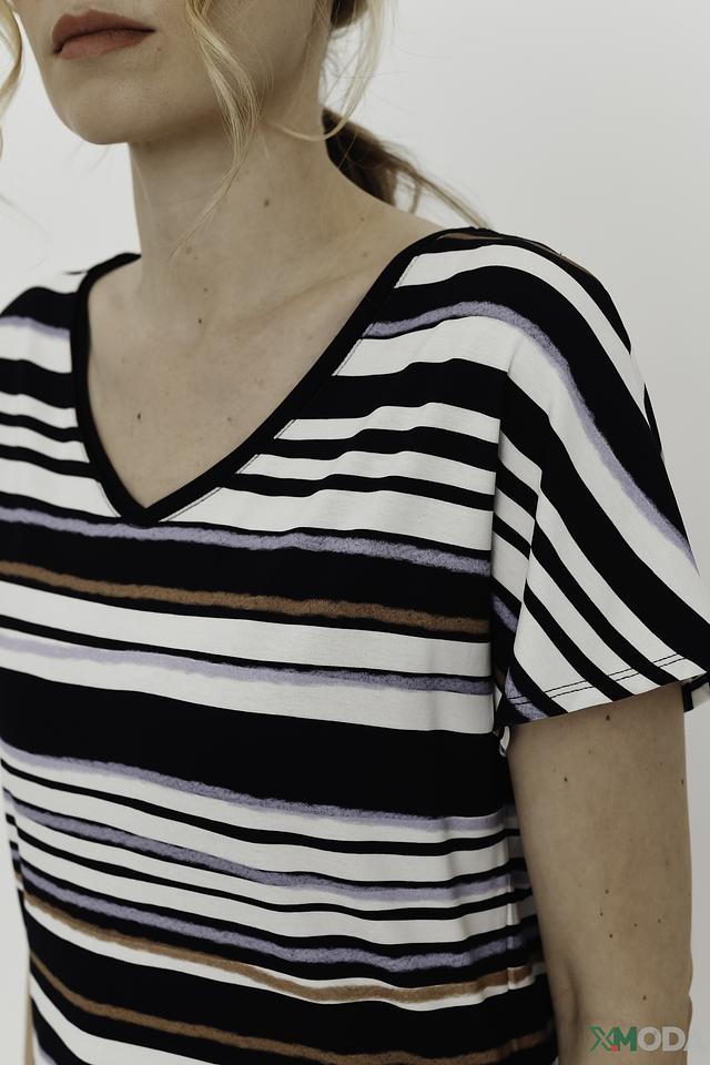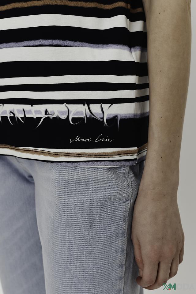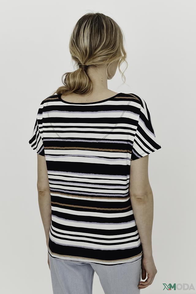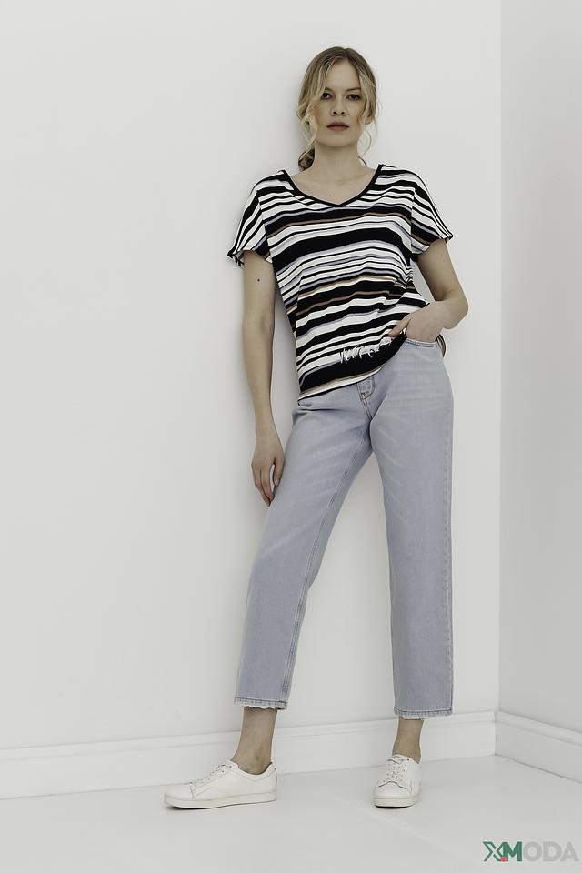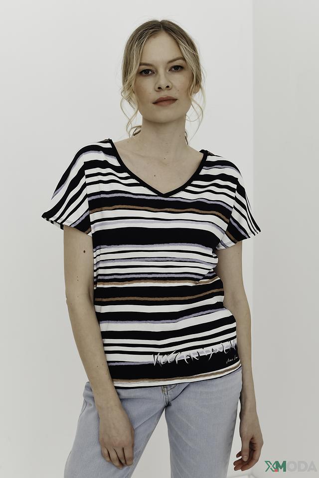 Женский пуловер Marc Cain чёрно-белого цвета с полоской и V-образным вырезом. Изготовлен из мягкого хлопка с добавлением эластана для комфортной посадки и сохранения формы. Состав: хлопок 95%, эластан 5%