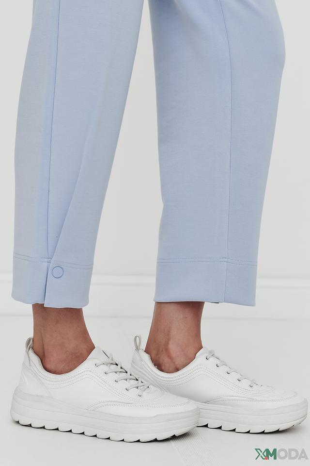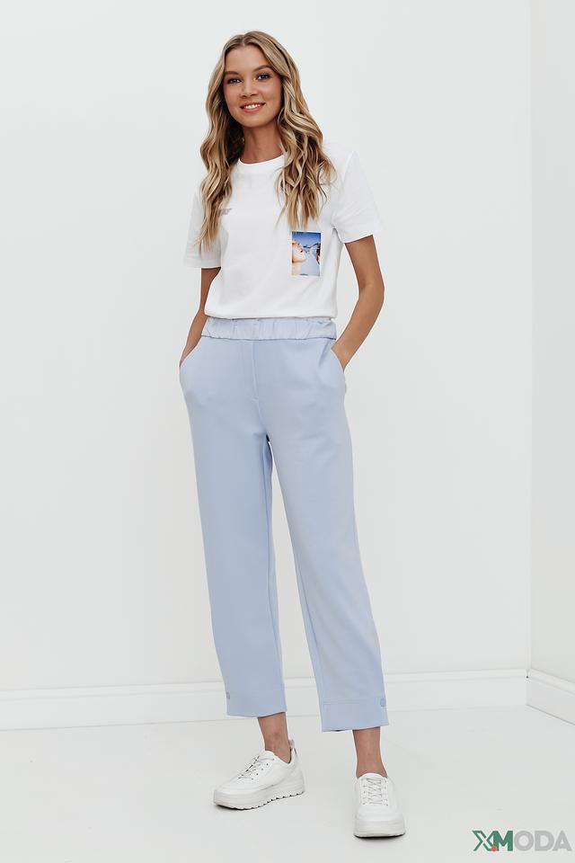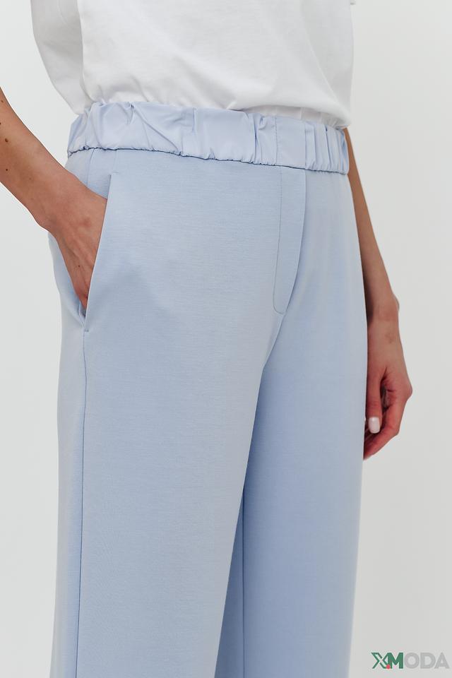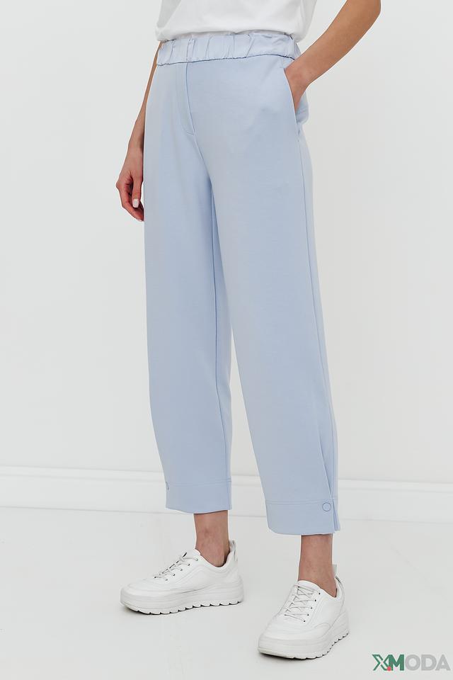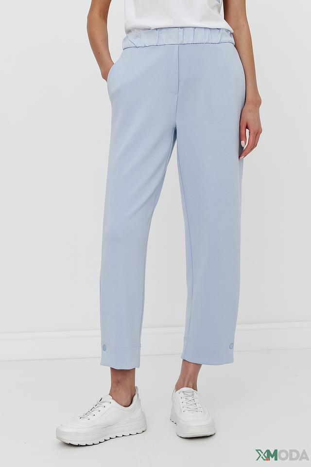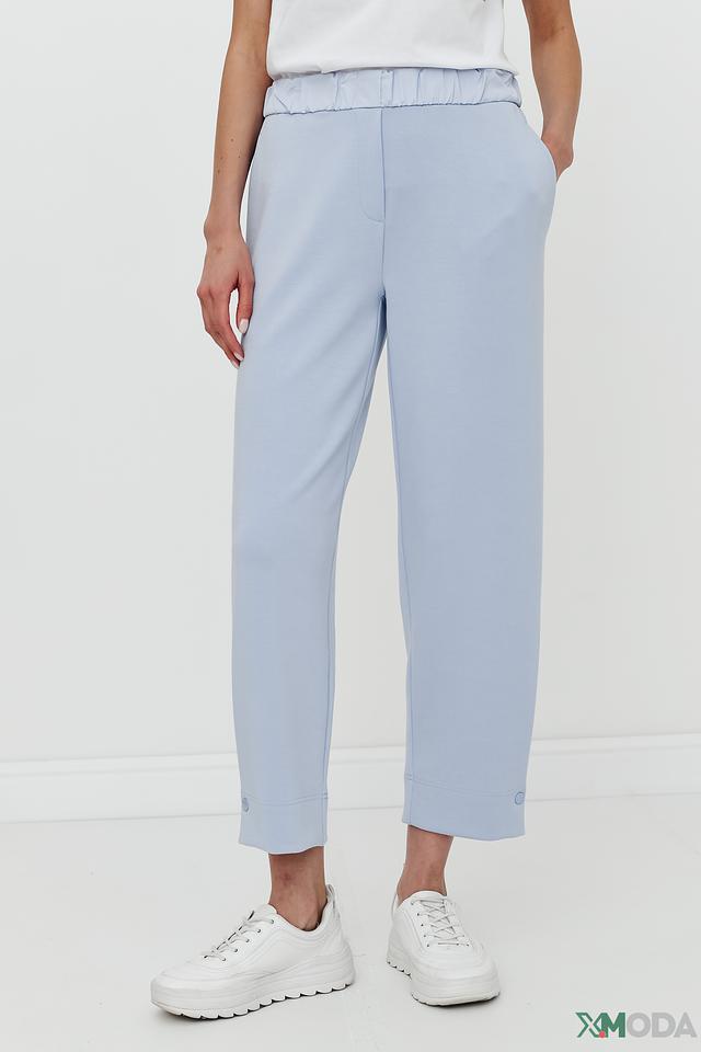 Брюки выполнены в нежном голубом цвете, который легко сочетается с другими элементами одежды. Удобный пояс на резинке обеспечивает комфортную посадку, а слегка зауженный крой подчеркивает фигуру.