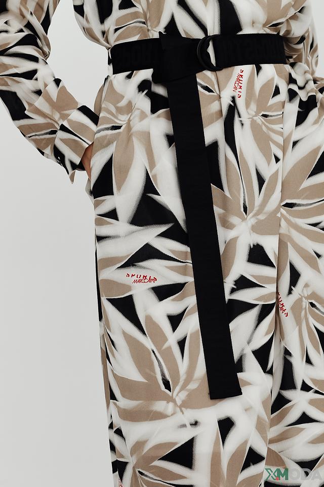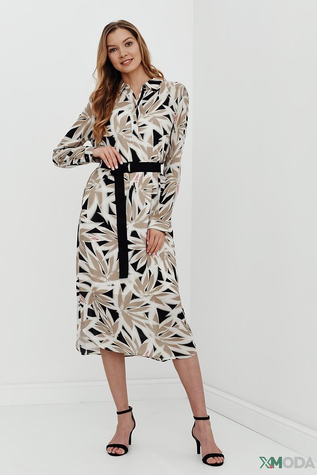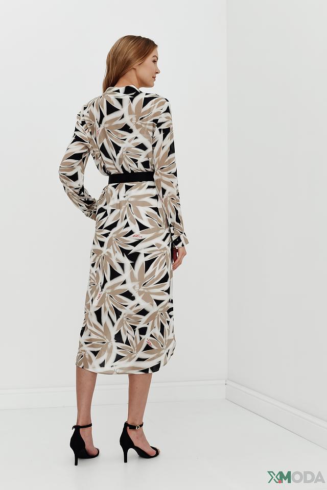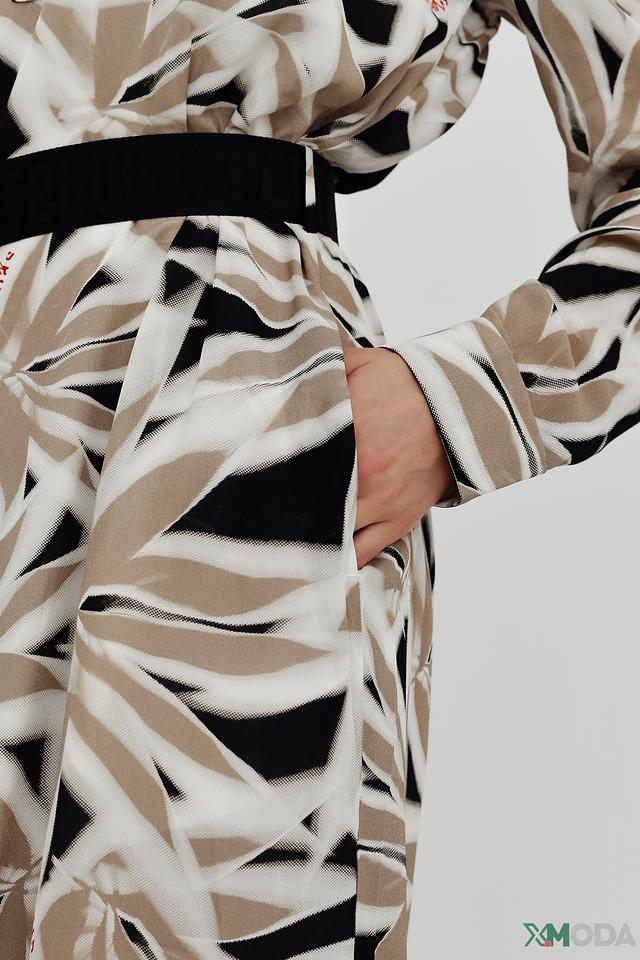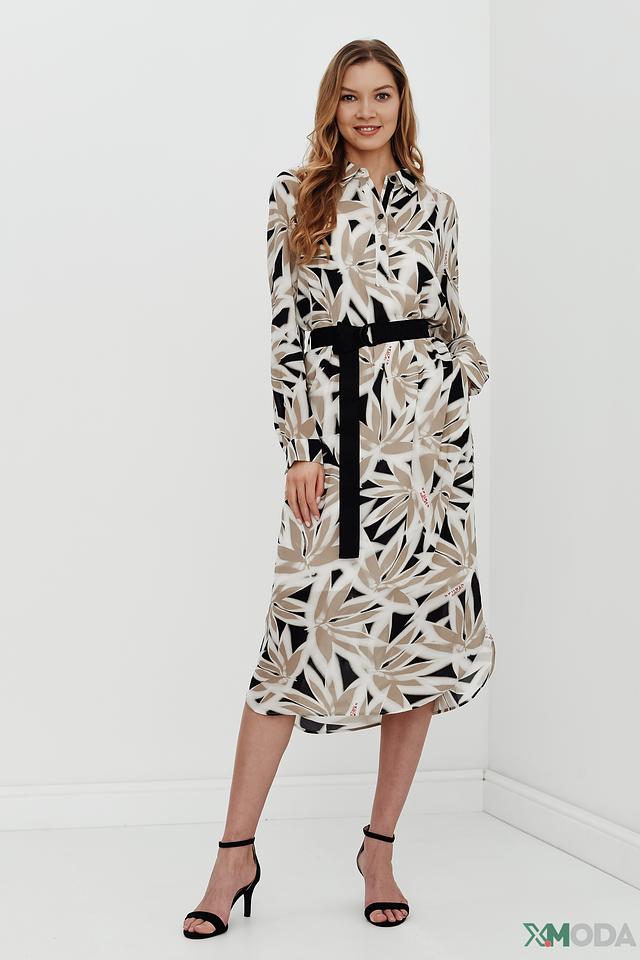 Платье Marc Cain бежевого цвета с оригинальным принтом в виде листьев. Модель выполнена в стиле рубашки с длинным рукавом и поясом, подчеркивающим талию. Идеальный выбор для создания стильного и комфортного образа. Состав: вискоза 100%, Состав_подкладка полиэстер 97%, Состав_подкладка эластан 3%
