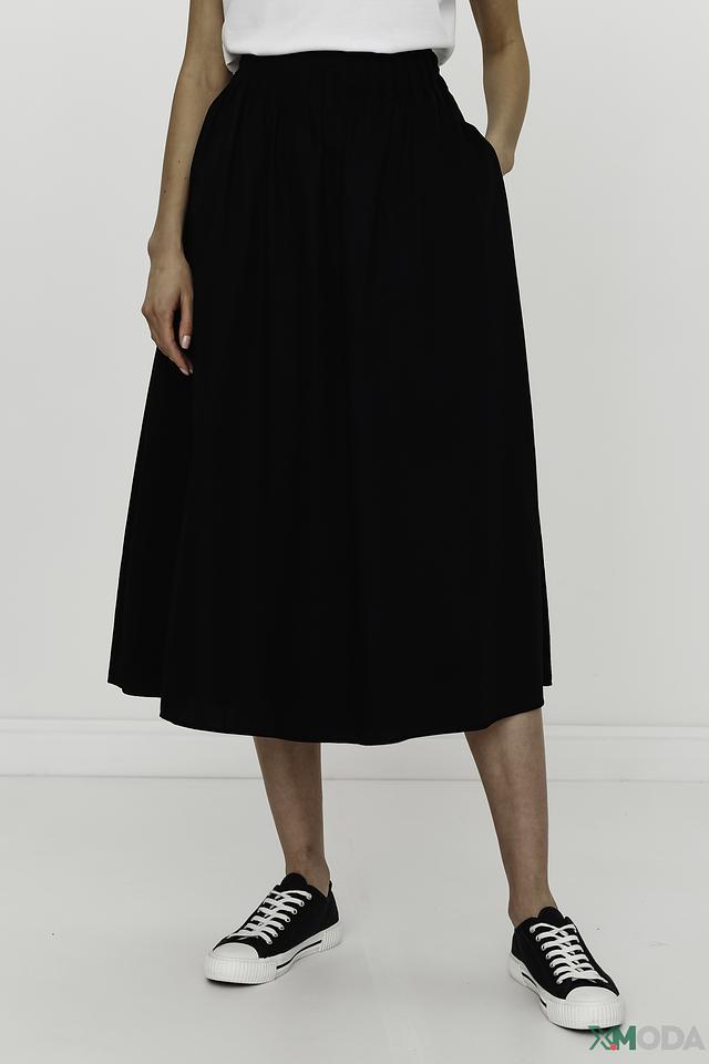 Юбка имеет классический чёрный цвет и длину миди, что делает её универсальной для различных образов. Эластичный пояс на талии обеспечивает удобную посадку и позволяет регулировать облегание.