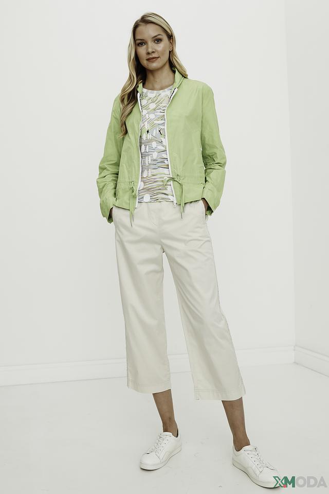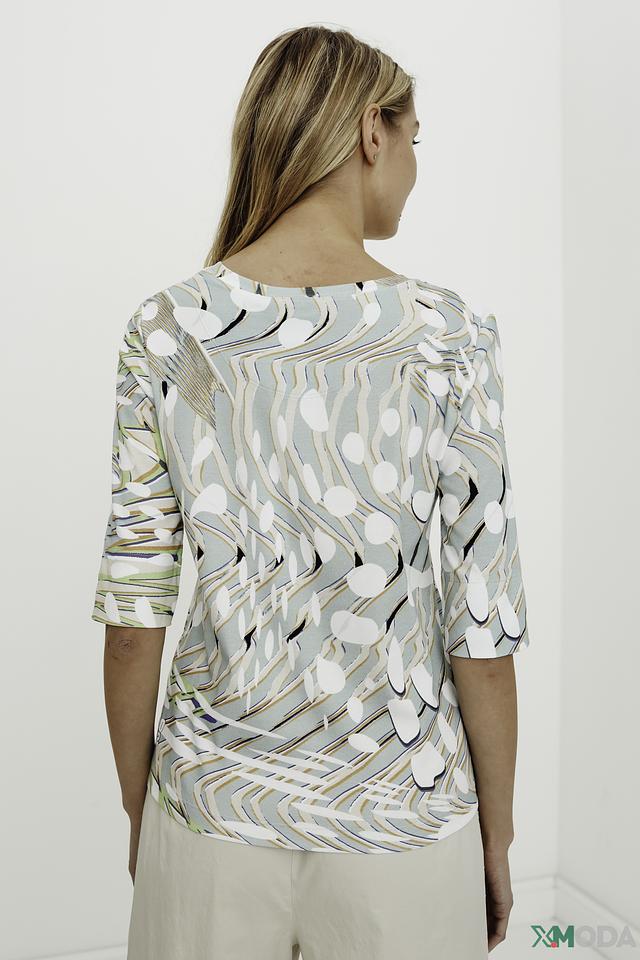 Женский лонгслив Marc Cain светло-зелёного цвета с оригинальным принтом в виде абстрактных листьев и горошка. Изготовлен из мягкого хлопка с добавлением эластана для комфорта и хорошей посадки. Состав: хлопок 94%, эластан 6%