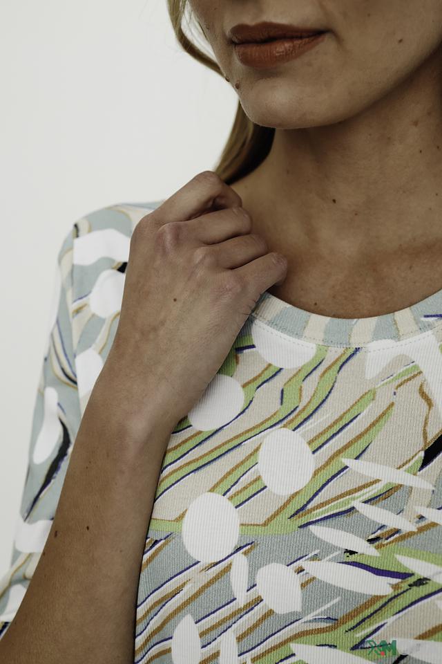 Лонгслив имеет оригинальный принт, выполненный в светло-зелёных, белых и бежевых тонах, изображающий абстрактные листья и горошек. Круглый вырез горловины и длинные рукава делают его универсальным для различных образов.