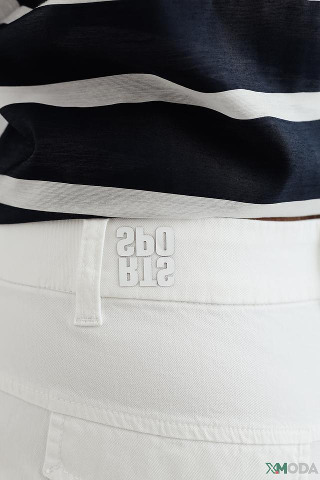 На поясе брюк расположен декоративный логотип бренда, добавляющий им изысканности. Брюки идеально подходят для создания как повседневных, так и более элегантных образов. Состав: хлопок 98%, эластан 2%.