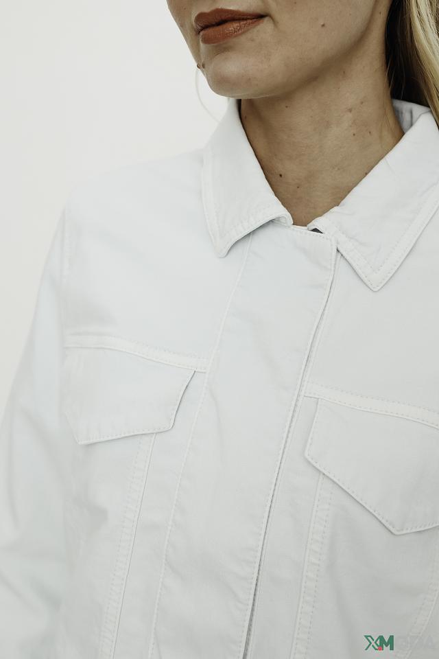 Жакет застегивается на молнию, что обеспечивает удобство и практичность. Накладные карманы добавляют функциональности и стиля. Изделие выполнено из высококачественного хлопка с добавлением эластана, что обеспечивает комфорт при носке и сохранение формы.