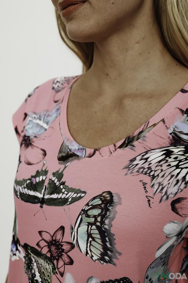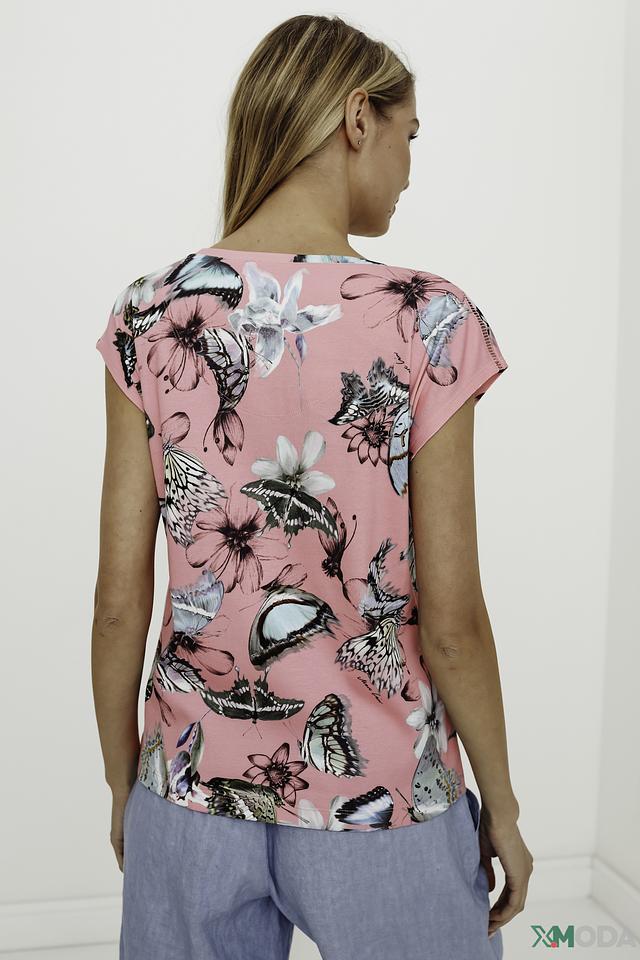 Эта стильная блуза от Marc Cain выполнена в нежном розовом цвете и украшена эффектным принтом с изображением бабочек и цветов. Модель имеет V-образный вырез горловины и короткие рукава с небольшими защипами, что придает ей лёгкий и романтичный вид.