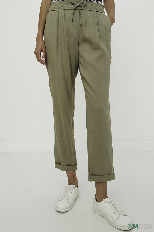 Брюки Marc Cain цвета хаки — это стильное и комфортное решение для повседневного гардероба. Модель выполнена из лёгкой ткани с добавлением вискозы и эластана, имеет удобный пояс на кулиске и зауженные книзу брючины. Состав: лен 59%, вискоза 39%, эластан 2%