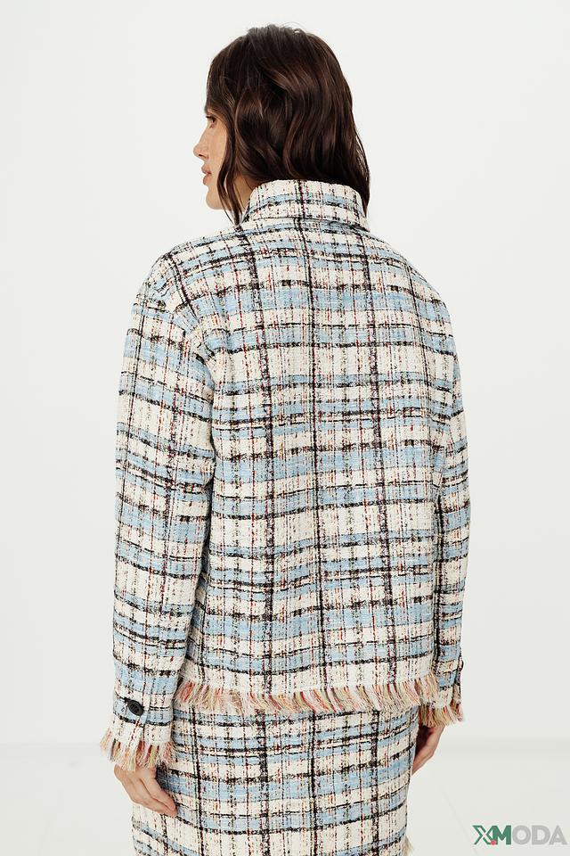 Жакет имеет лацканы, застежку на пуговицы и длинные рукава. По низу и на карманах присутствует декоративная бахрома, которая добавляет образу оригинальности и динамики. Жакет выполнен из высококачественного материала, в состав которого входит хлопок, полиэстер, акрил, полиамид и вискоза.