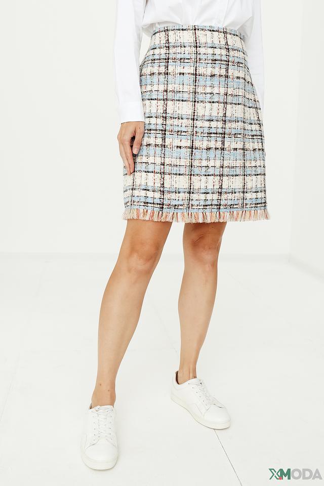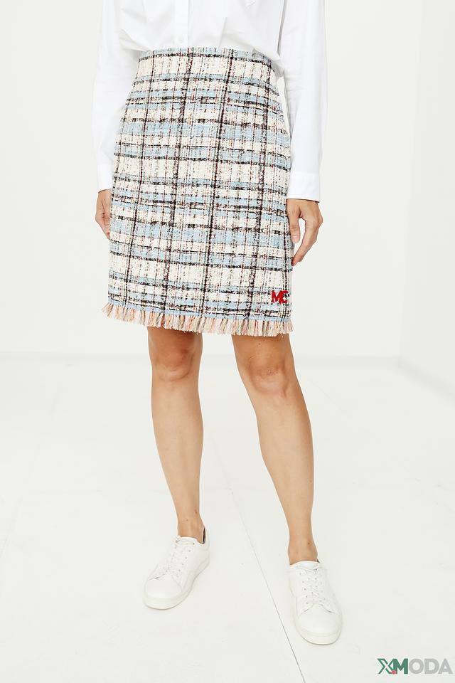 Эта юбка от Marc Cain станет ярким акцентом вашего гардероба. Модель выполнена из высококачественного твида в классическую клетку, сочетающую голубые, белые и бежевые оттенки.