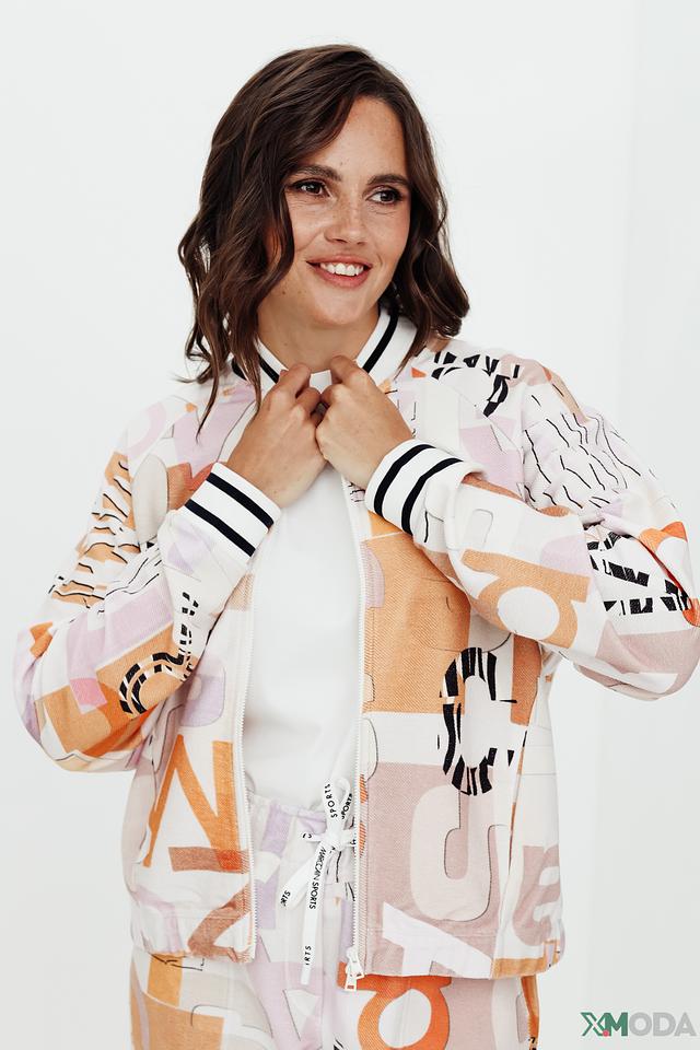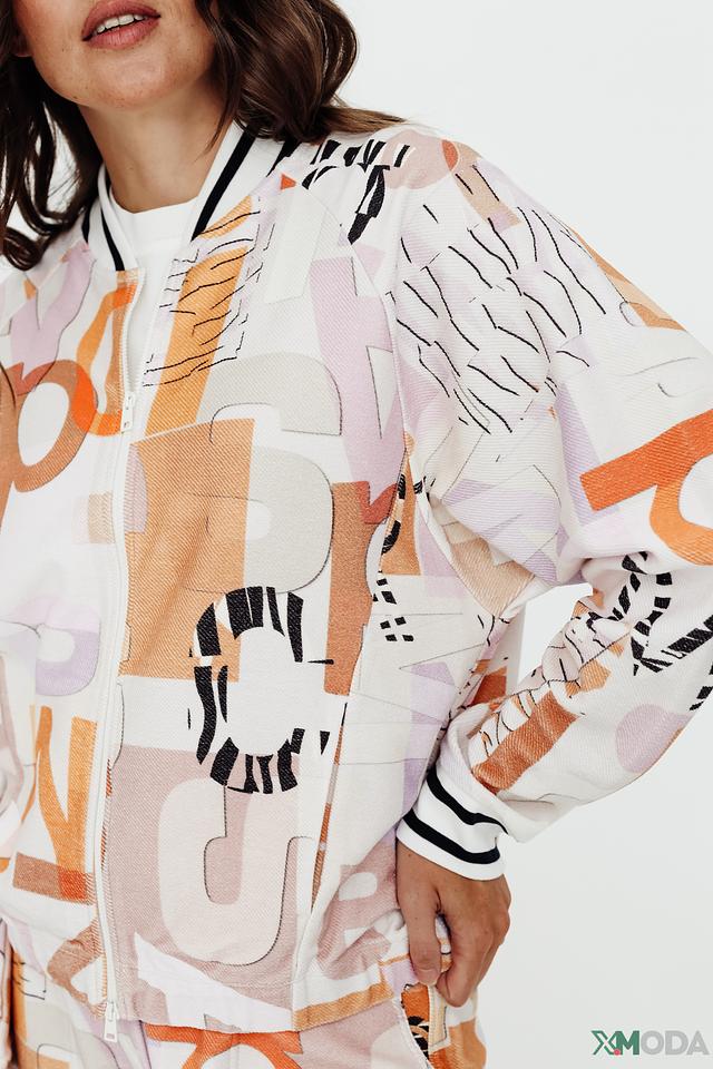 Жакет имеет свободный крой и застегивается на молнию. Дизайн украшен оригинальным принтом, сочетающим в себе различные элементы и оттенки.