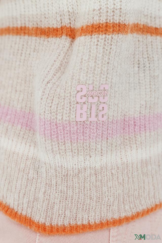 Этот стильный пуловер от Marc Cain выполнен в актуальной полосатой расцветке. Преобладающий светло-серый цвет гармонично сочетается с оранжевыми и лиловыми полосами, создавая яркий и запоминающийся образ.