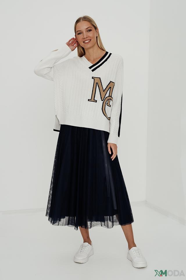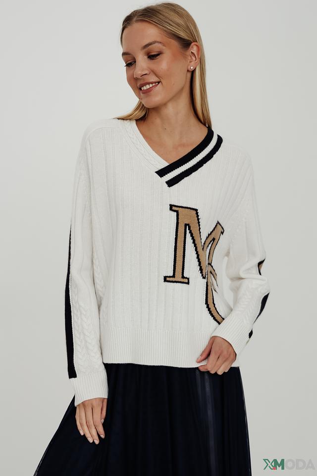 Передняя часть пуловера украшена декоративной буквой "M", выполненной в золотистом и чёрном цвете, что придает изделию особый шарм и узнаваемость. Рукава и горловина отделаны полосками в чёрно-золотистой гамме, добавляя контраст и динамику.