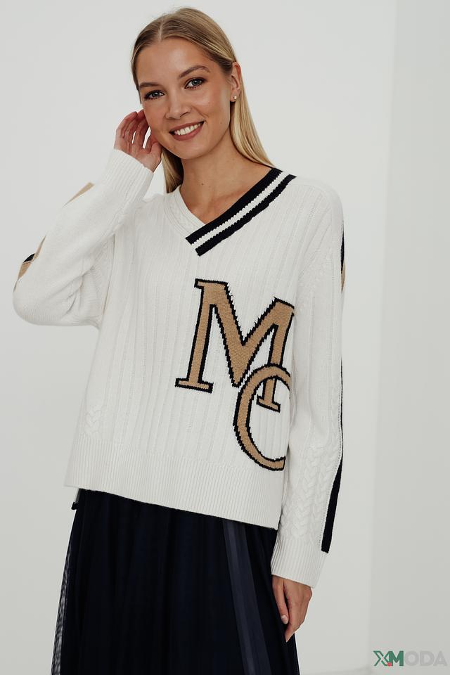 Белый пуловер Marc Cain с V-образным вырезом и декоративной буквой "M" на передней части. Изготовлен из высококачественной шерсти и кашемира для максимального комфорта и тепла. Состав: шерсть 90%, кашемир 10%