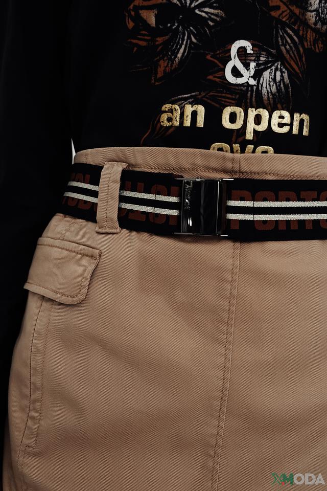 Особый акцент в дизайне юбки – это пояс в тон с контрастной полосатой отделкой, который подчеркивает талию и придает образу завершенность. Наличие боковых карманов добавляет практичности и удобства.