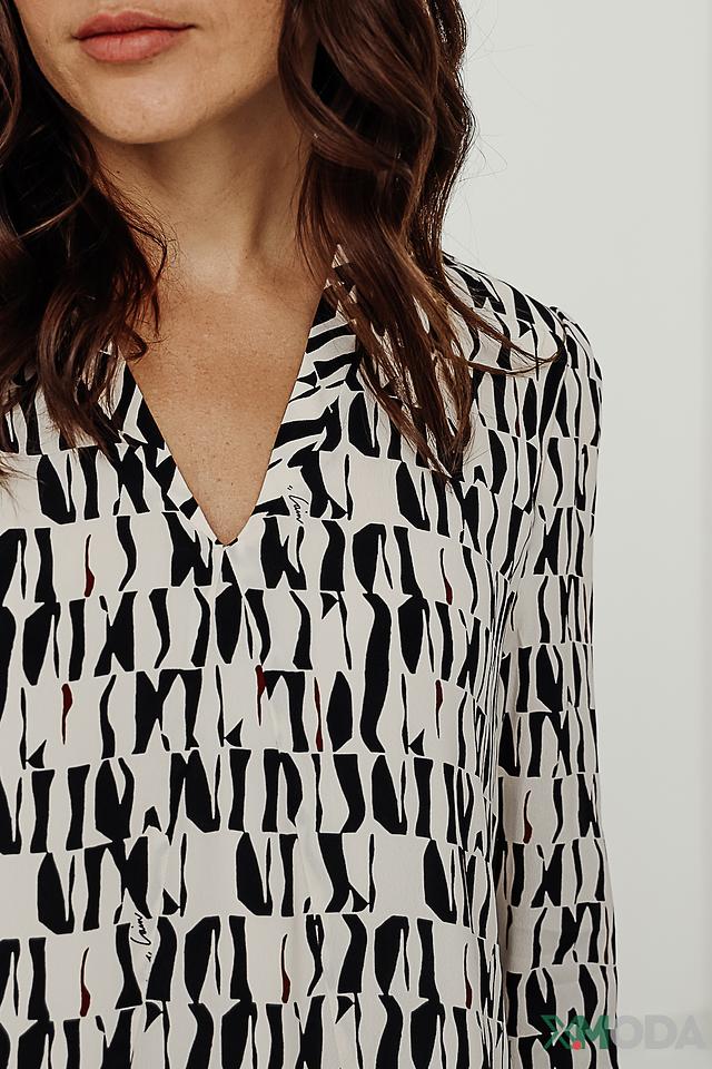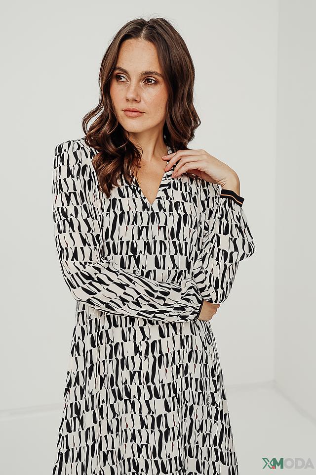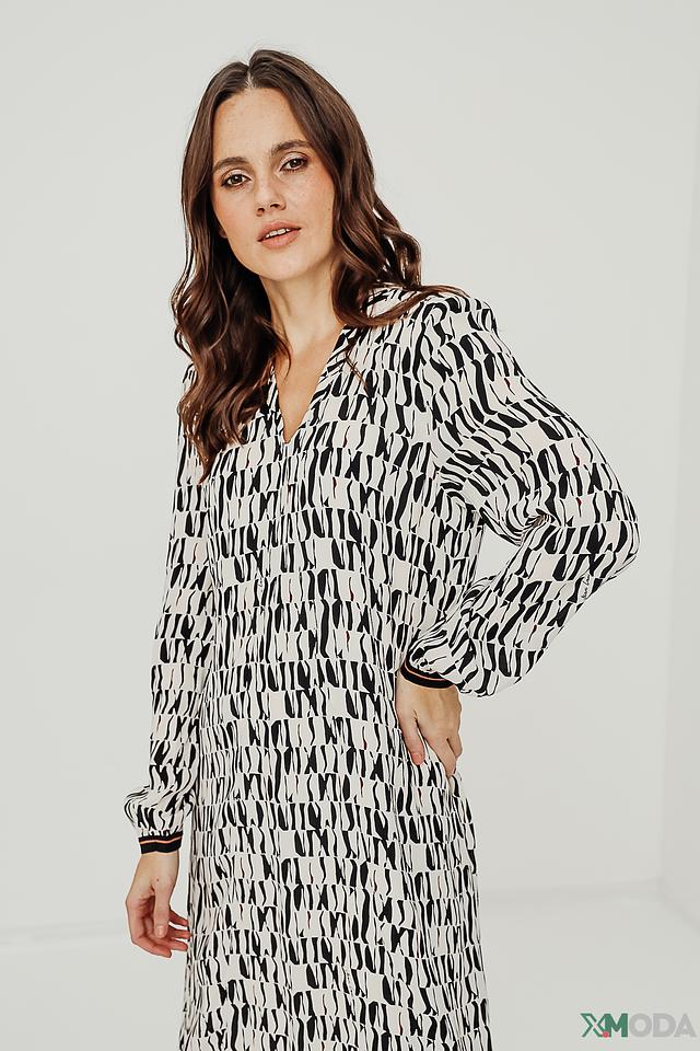 Платье Marc Cain чёрно-белого цвета с оригинальным абстрактным принтом. Модель выполнена из лёгкой ткани на основе вискозы и шёлка, имеет V-образный вырез и длинные рукава. Состав: вискоза 66%, шелк 34%