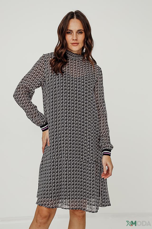 Основной цвет платья – чёрный, но его визуально оживляет яркий геометрический принт, выполненный в фиолетовых и белых тонах. Платье имеет прямой силуэт, длину чуть выше колена и длинные рукава с манжетами, отделанными контрастной полосой.