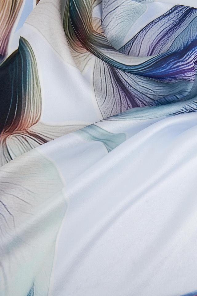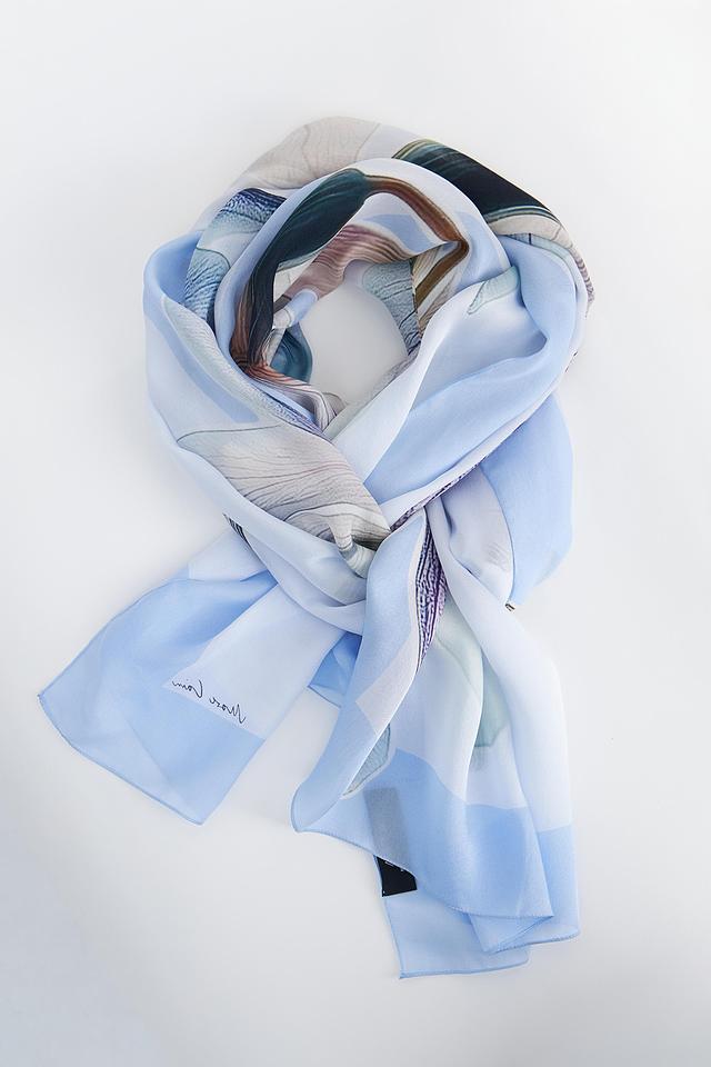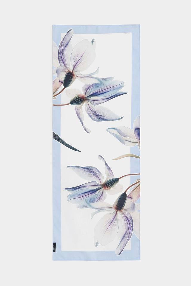 Шарф имеет прямоугольную форму и украшен ярким и детализированным цветочным принтом, выполненным в нежных оттенках голубого, белого и серого. Принт изображает крупные цветы, создавая эффектный и запоминающийся образ.
