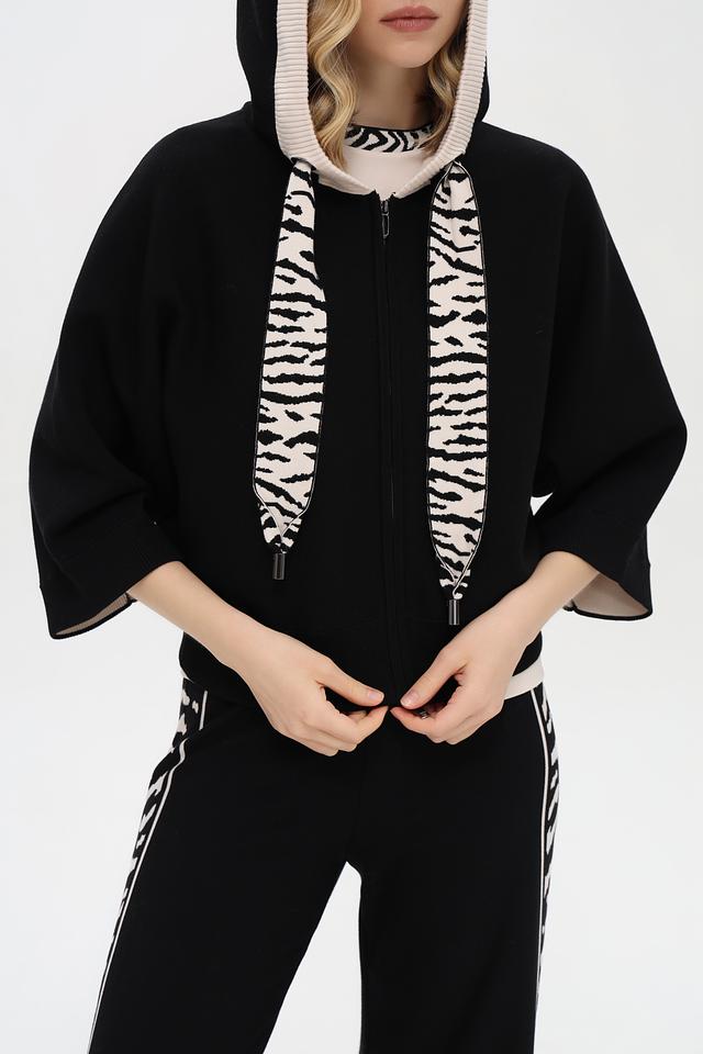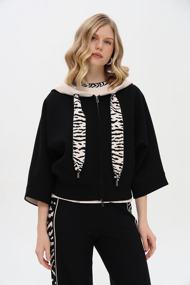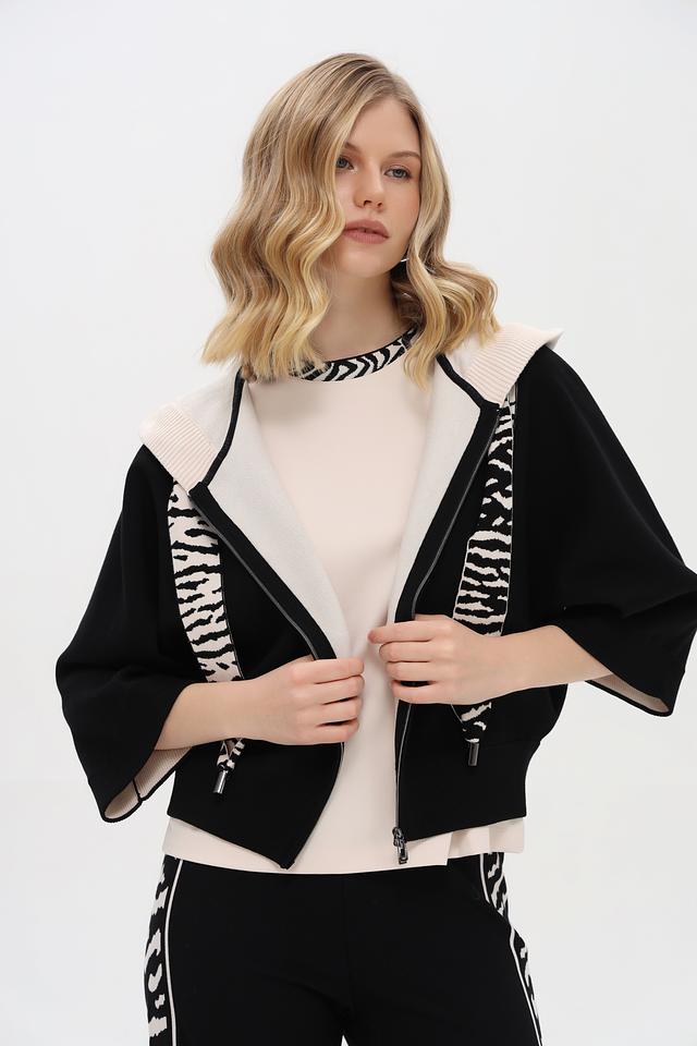 Чёрный жакет Marc Cain с короткими рукавами и оригинальным зебровым принтом на подкладке. Модель на молнии с высоким воротником-стойкой добавит изюминку вашему образу. Состав: вискоза 72%, полиэстер 28%