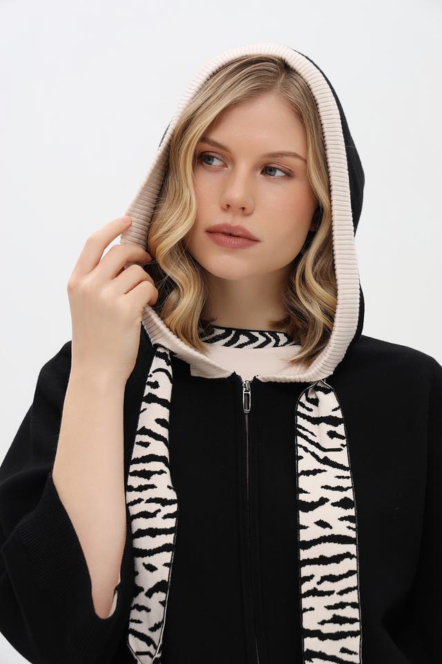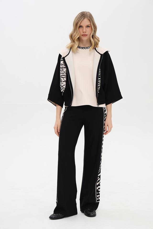 Этот стильный жакет от Marc Cain станет ярким акцентом вашего гардероба. Выполненный в классическом чёрном цвете, он отличается необычным дизайном с зебровым принтом на внутренней стороне воротника и планок застёжки-молнии.