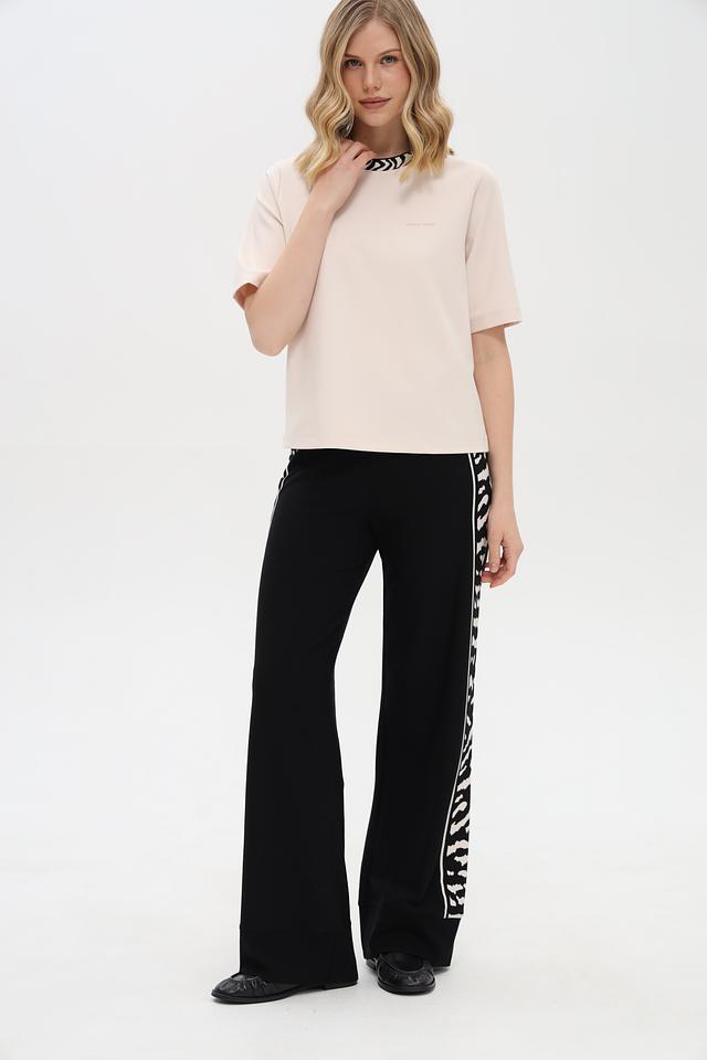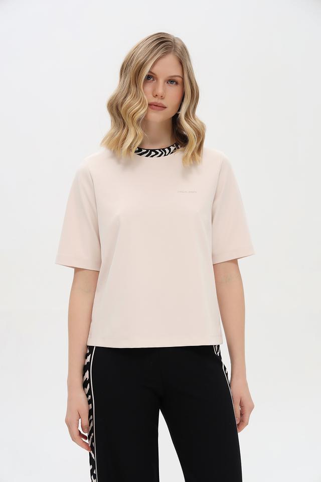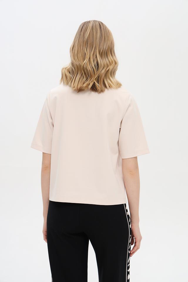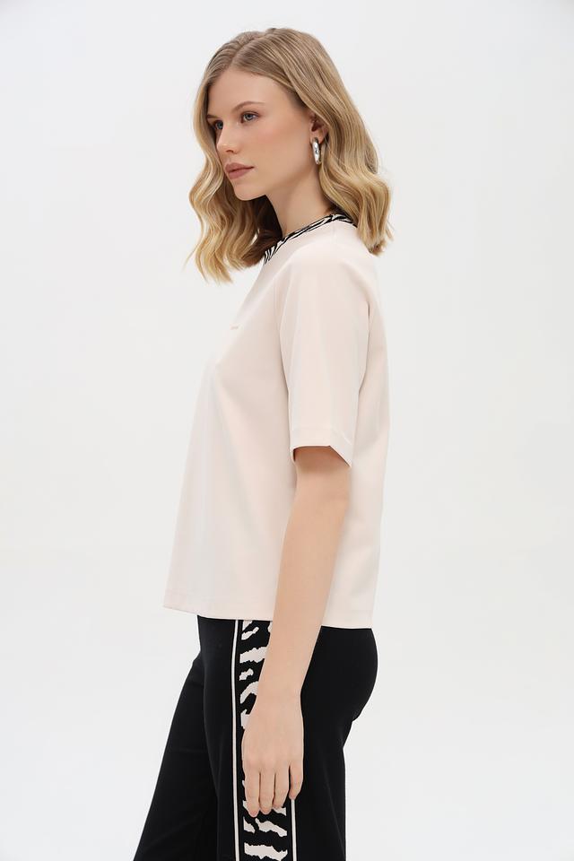 Футболка имеет нежно-розовый цвет и короткие рукава. Особый акцент сделан на оригинальном воротнике с контрастной отделкой, который придает образу изысканность и индивидуальность.