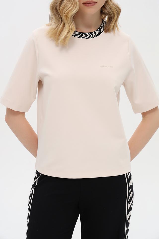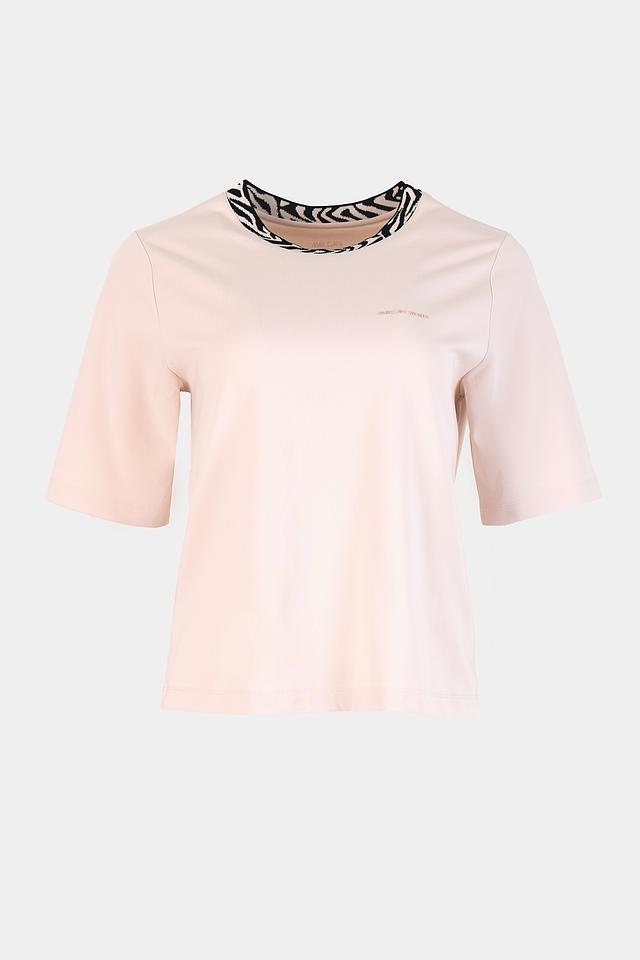 Женская футболка Marc Cain нежно-розового цвета с короткими рукавами и оригинальным воротником. Изготовлена из мягкого хлопка с добавлением модала и эластана для комфорта и отличной посадки. Состав: хлопок 47%, модал 47%, эластан 6%