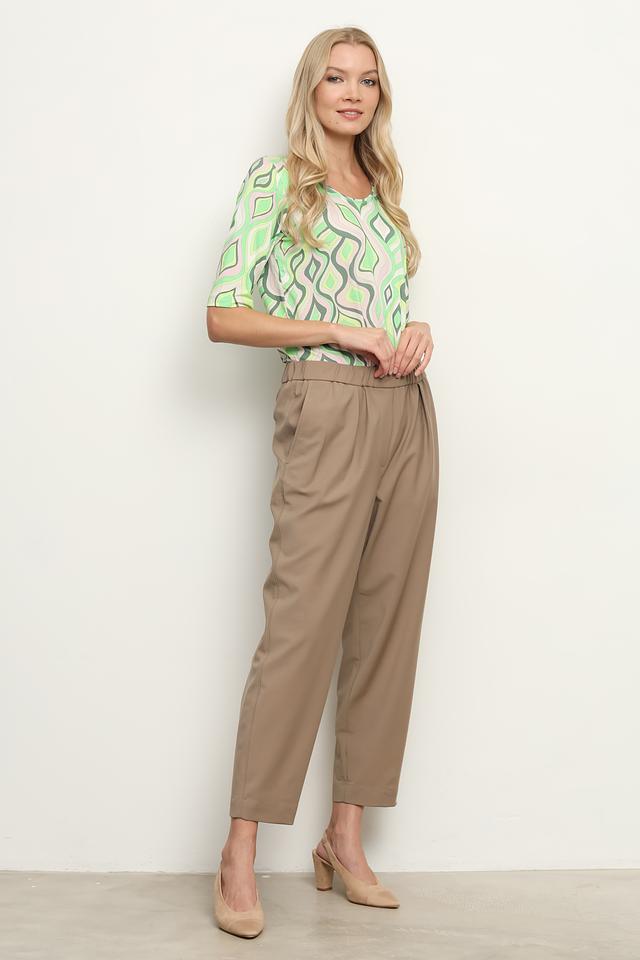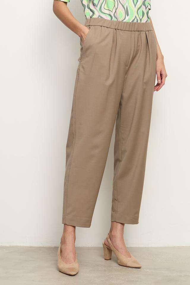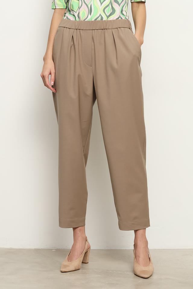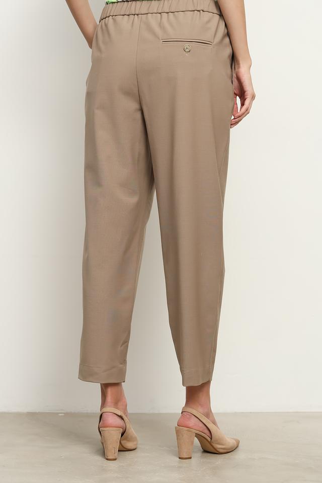 Цвет брюк – бежевый, что делает их универсальными и легко сочетаемыми с различными элементами одежды. На брюках имеются боковые карманы и аккуратные складки спереди, придающие им более классический вид. Задний карман оформлен одной пуговицей.