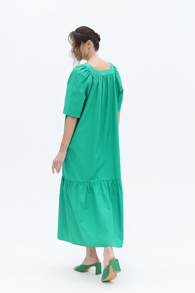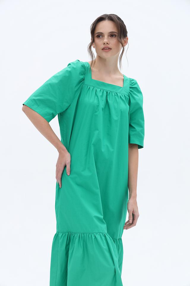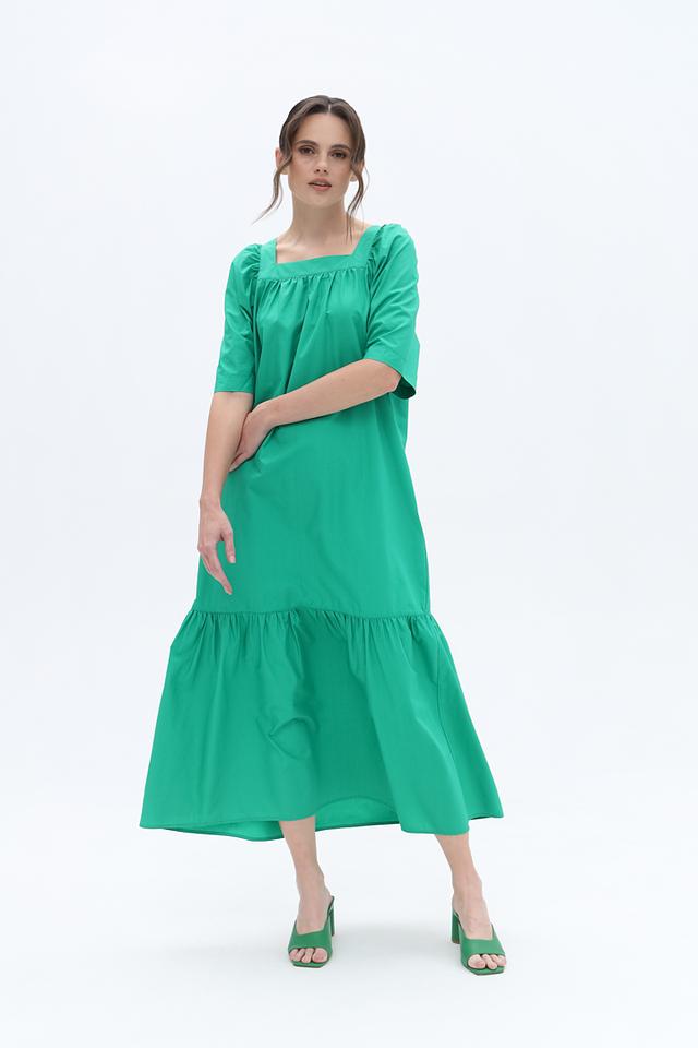 Платье отличается квадратным вырезом горловины и короткими рукавами с небольшими сборками, что придает ему женственность. Юбка платья выполнена в форме яруса, добавляя образу легкости и динамики.