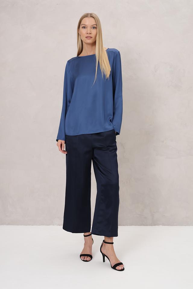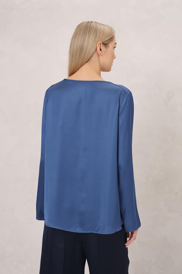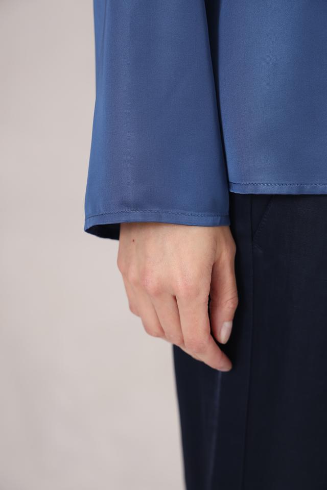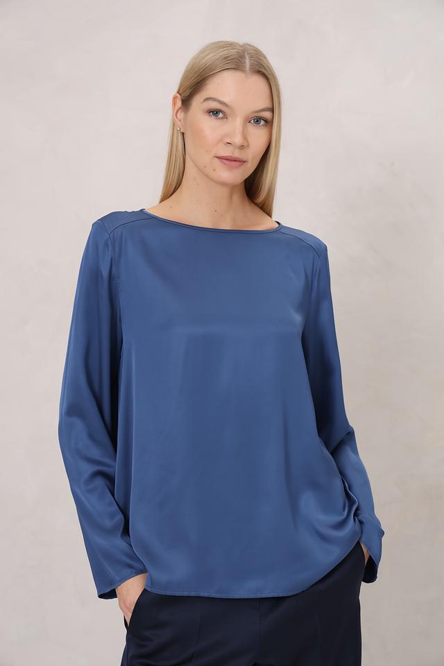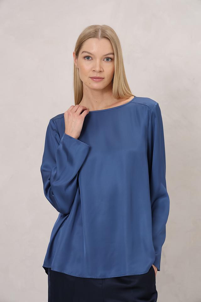 Особенностью данной модели является её лаконичный дизайн и спокойный синий цвет. Круглый вырез горловины и длинные рукава придают блузе классический вид. Она идеально подходит для создания как повседневных, так и более формальных образов.