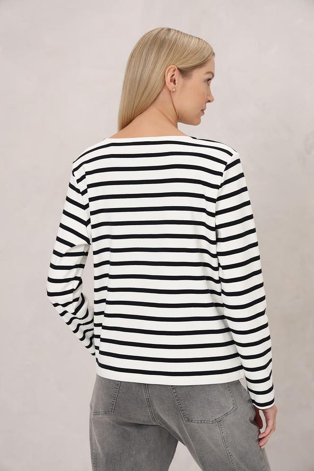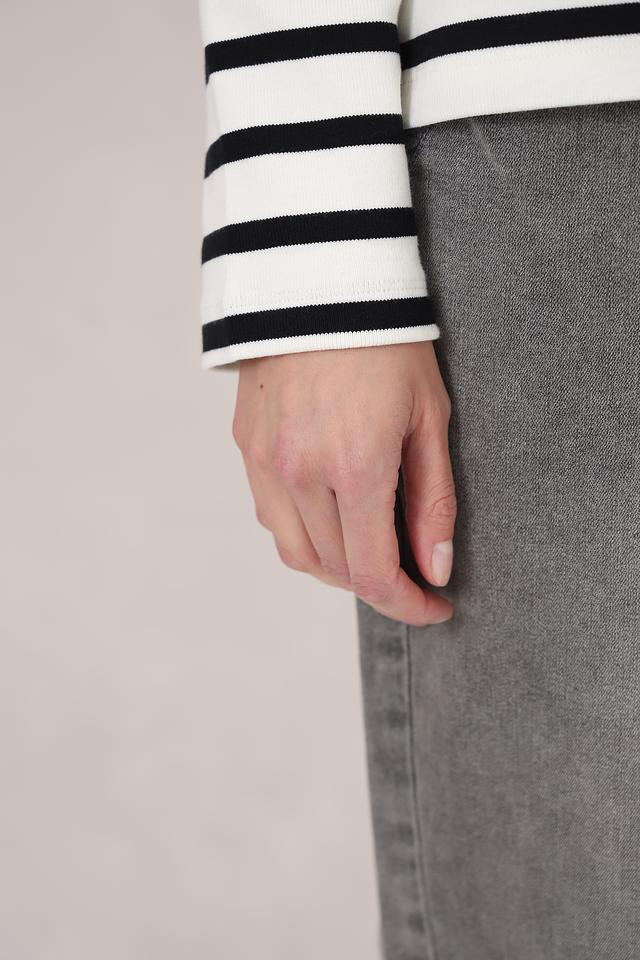 Классический крой и универсальная бело-чёрная полоска делают этот пуловер подходящим для создания различных образов – от повседневных до более элегантных. Округлый вырез горловины и длинные рукава добавляют модели практичности и удобства.