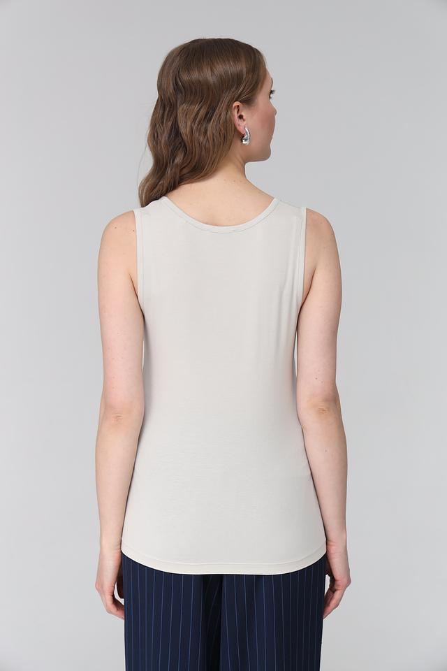 Топ выполнен из приятной к телу ткани, сочетающей в себе модал, хлопок и эластан. Благодаря этому он хорошо драпируется, обеспечивает комфорт при носке и сохраняет форму.
