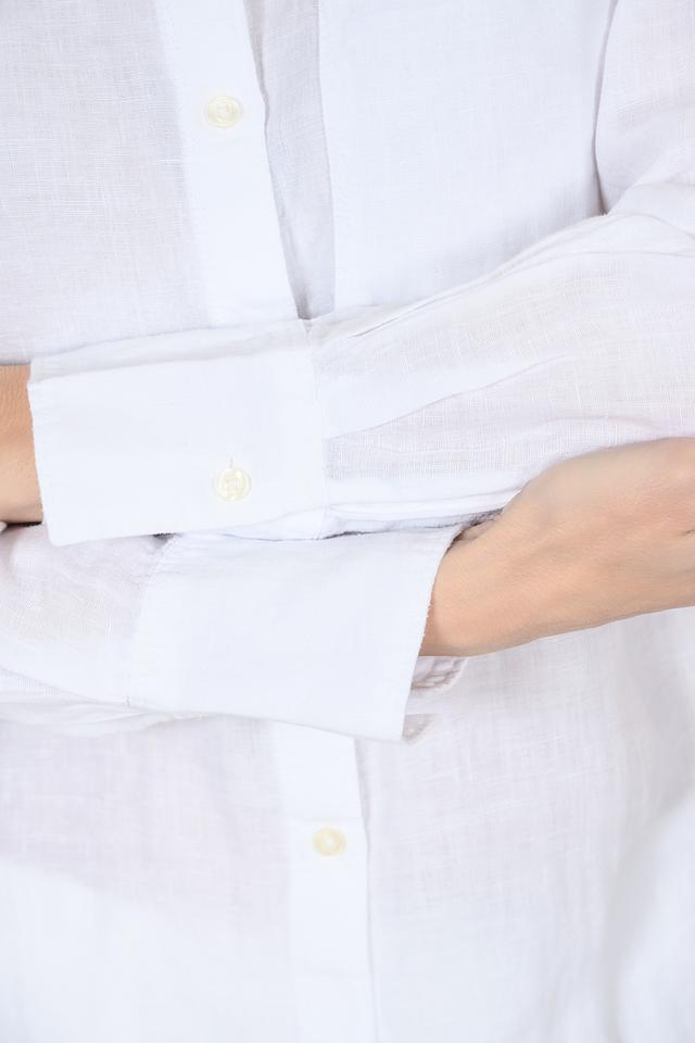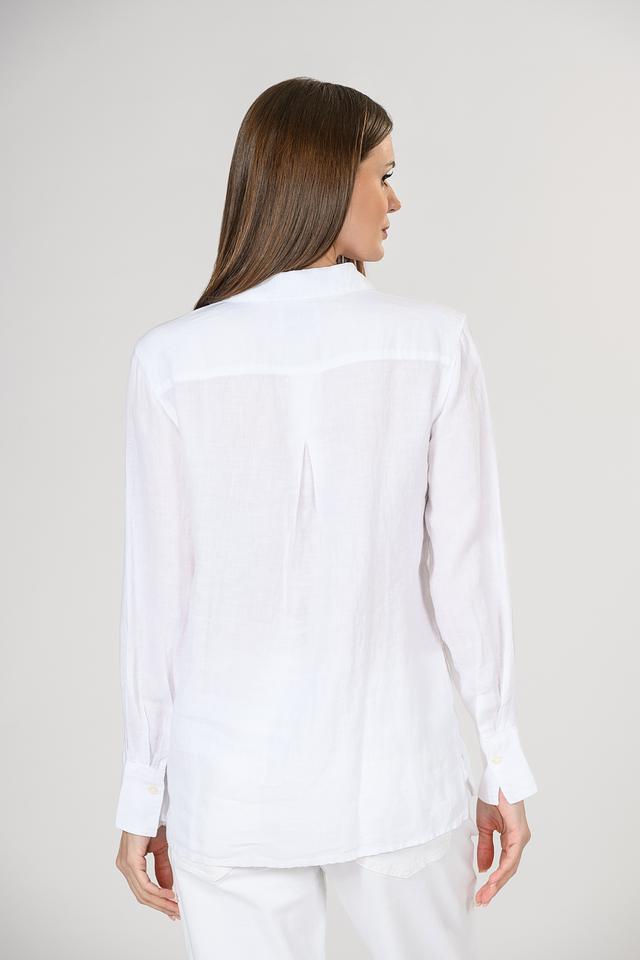 Рубашка имеет классический крой с длинными рукавами и отложным воротником. Застежка на пуговицы по всей длине. На груди расположен накладной карман, добавляющий функциональности и непринужденности образу. Ткань рубашки имеет слегка выраженную текстуру, характерную для натурального льна.
