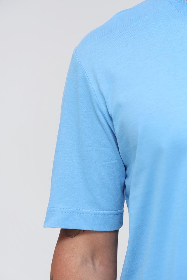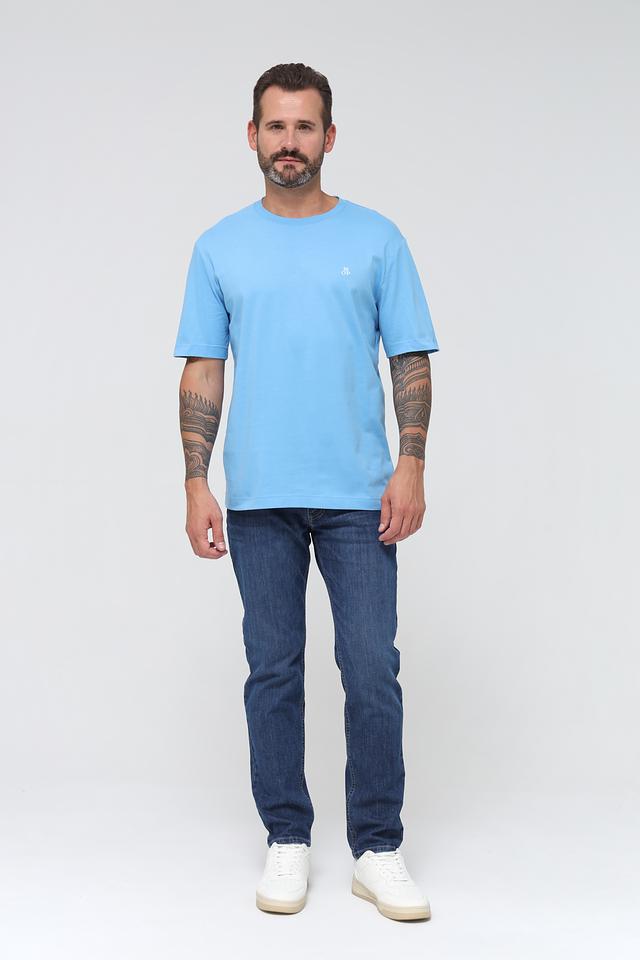 Футболка имеет круглый вырез горловины и короткие рукава. Небольшой логотип бренда, вышитый на груди, добавляет изысканности и узнаваемости. Голубой цвет футболки универсален и легко сочетается с различными элементами гардероба.