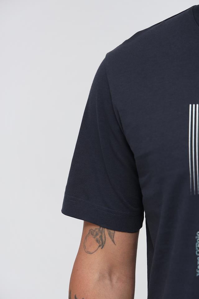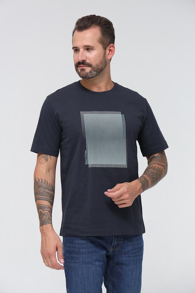 Эта мужская футболка от Marc O Polo выполнена в классическом крое и имеет круглый вырез горловины. Основной цвет футболки – тёмно-синий, который отлично сочетается с белым графическим принтом на передней части.