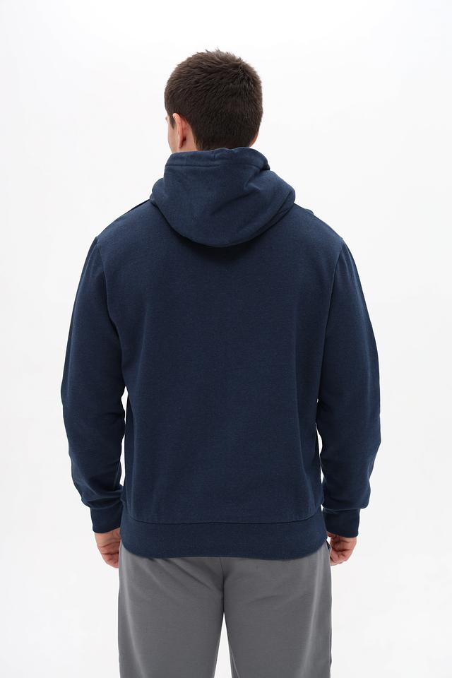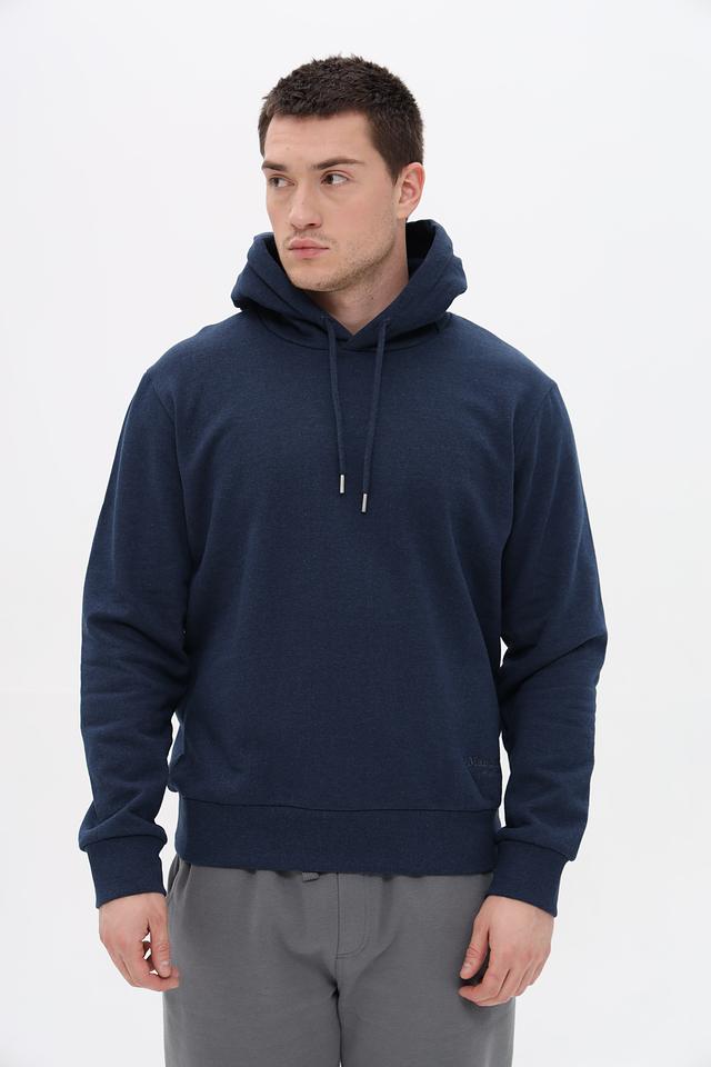 Модель имеет классический крой с капюшоном и карманами. Синий цвет толстовки универсален и легко сочетается с другими элементами гардероба.