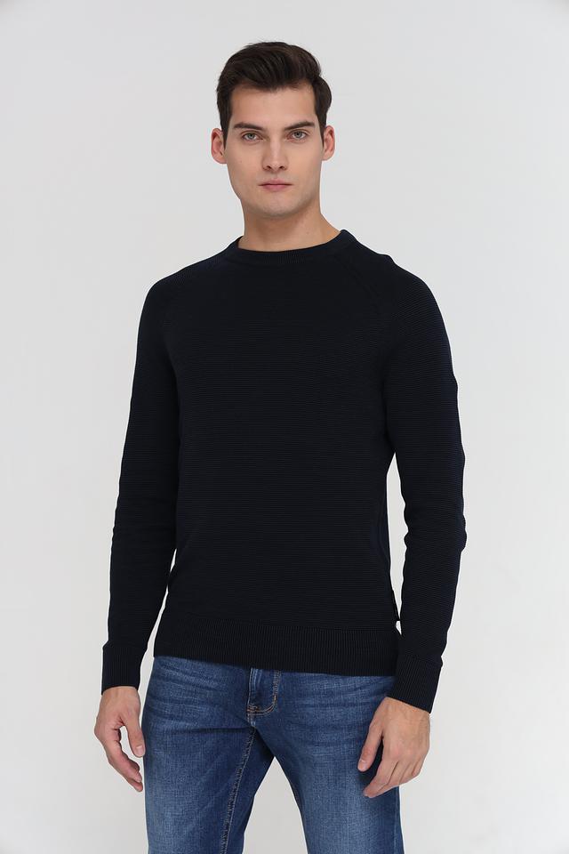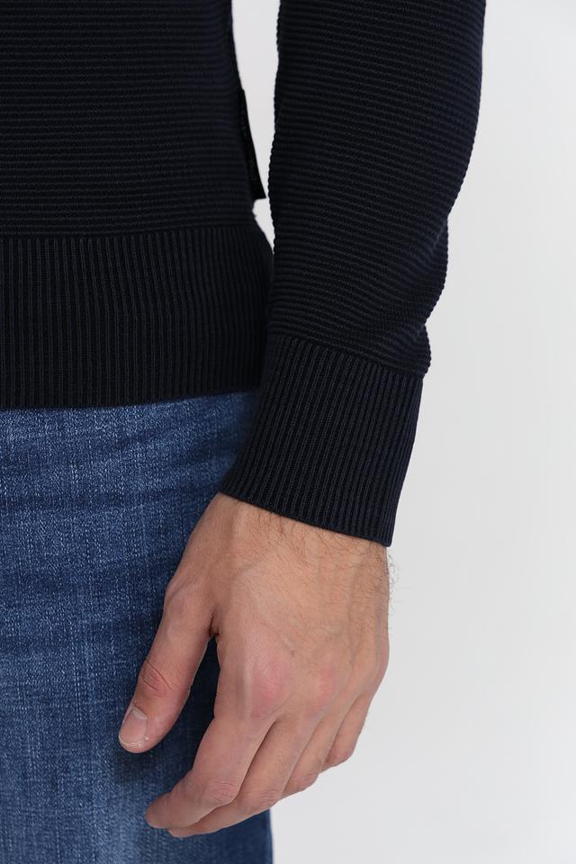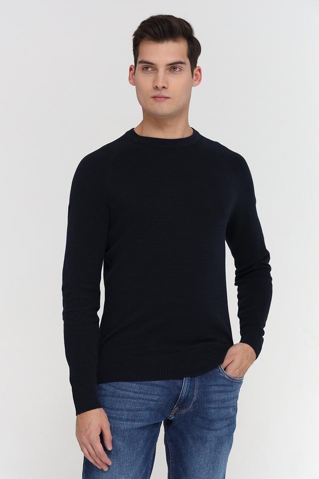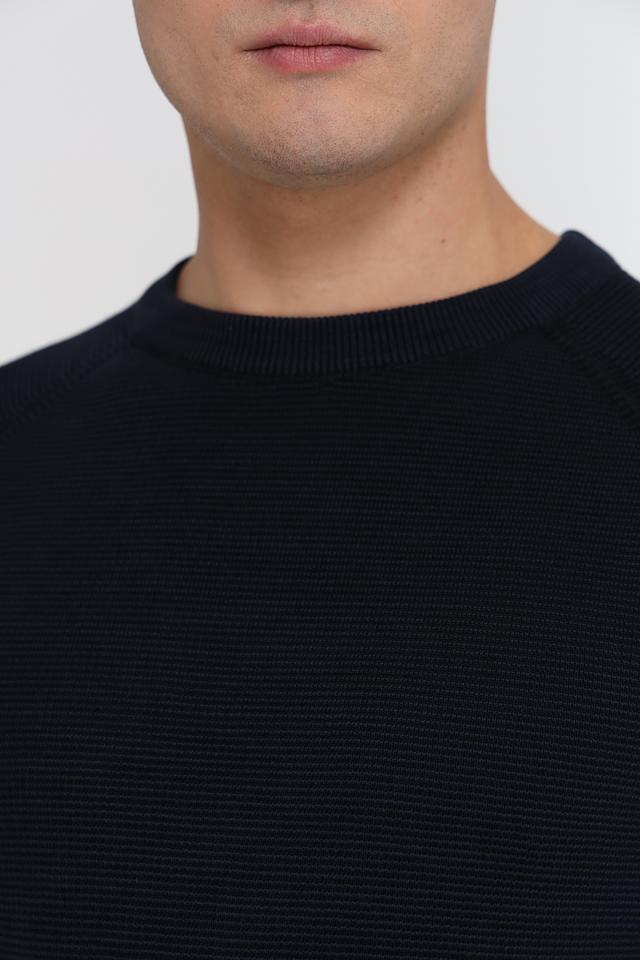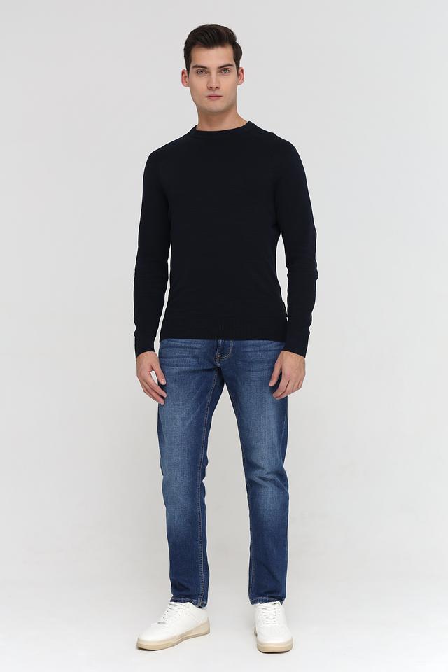 Джемпер имеет классический крой с круглым вырезом горловины и длинными рукавами. Тёмно-синий цвет делает его универсальным и легко сочетаемым с различными элементами гардероба. Текстурная вязка добавляет изделию объём и интересную фактуру.