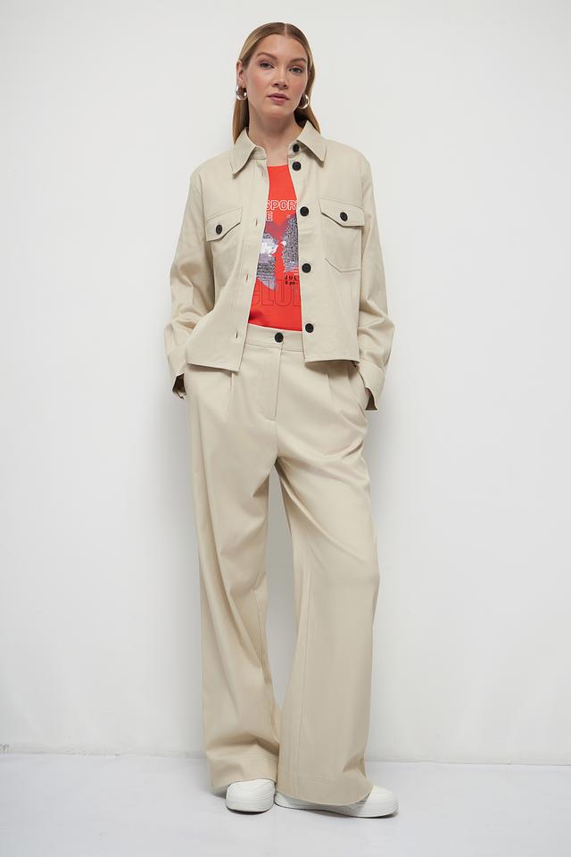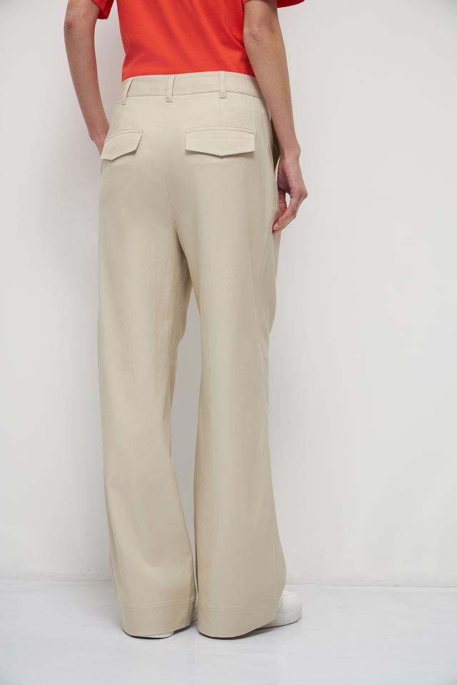 Брюки имеют прямой крой и высокую посадку, что обеспечивает комфортную посадку по фигуре и свободу движений. Модель дополнена аккуратными складками спереди, которые придают ей элегантный вид.