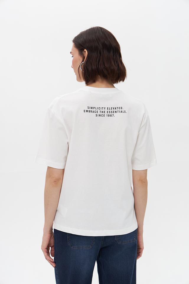 На спине футболки размещена надпись “SIMPLICITY ELEVATED. EMBRACE THE ESSENTIALS. SINCE 1967.”, добавляющая оригинальности образу. Эта футболка идеально сочетается с джинсами, шортами или юбками, создавая стильный и непринужденный образ.
