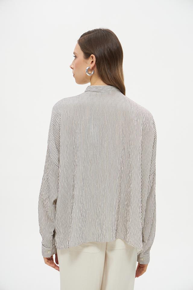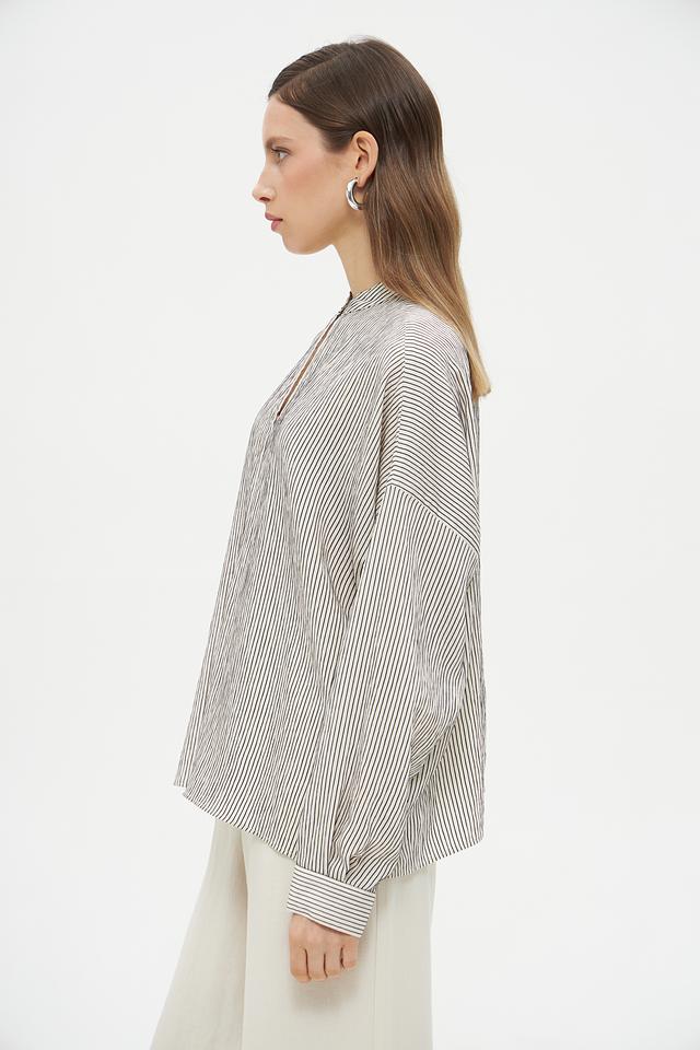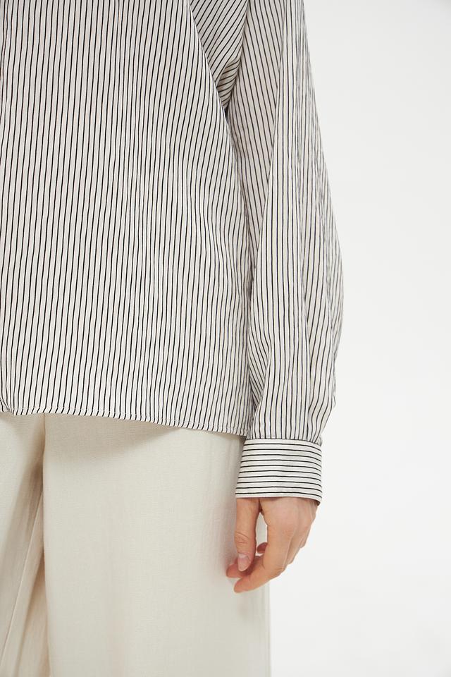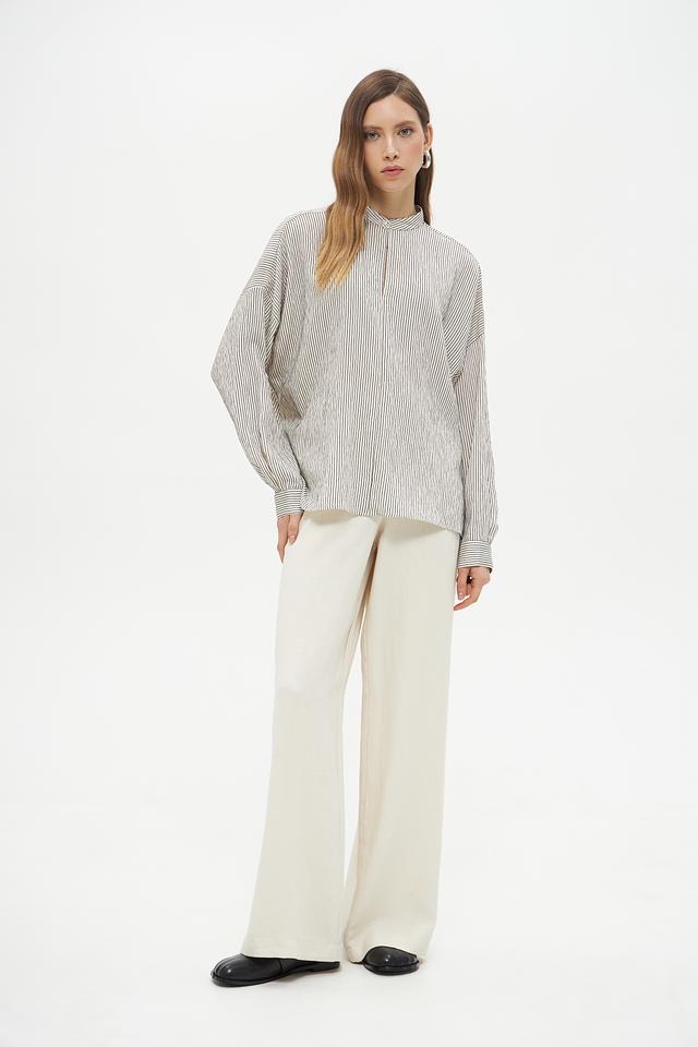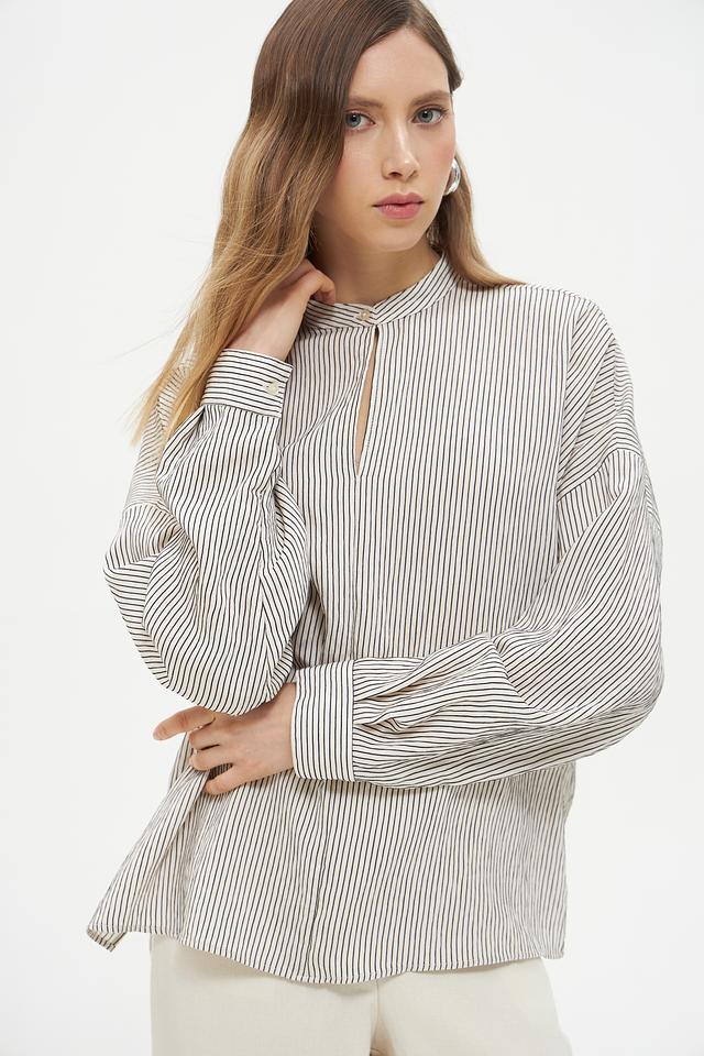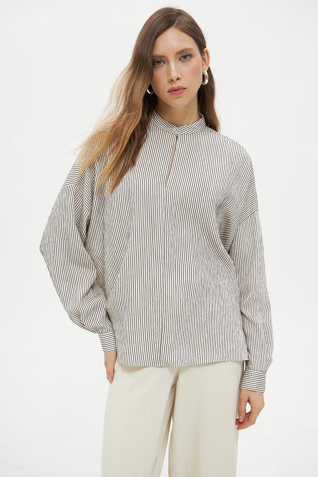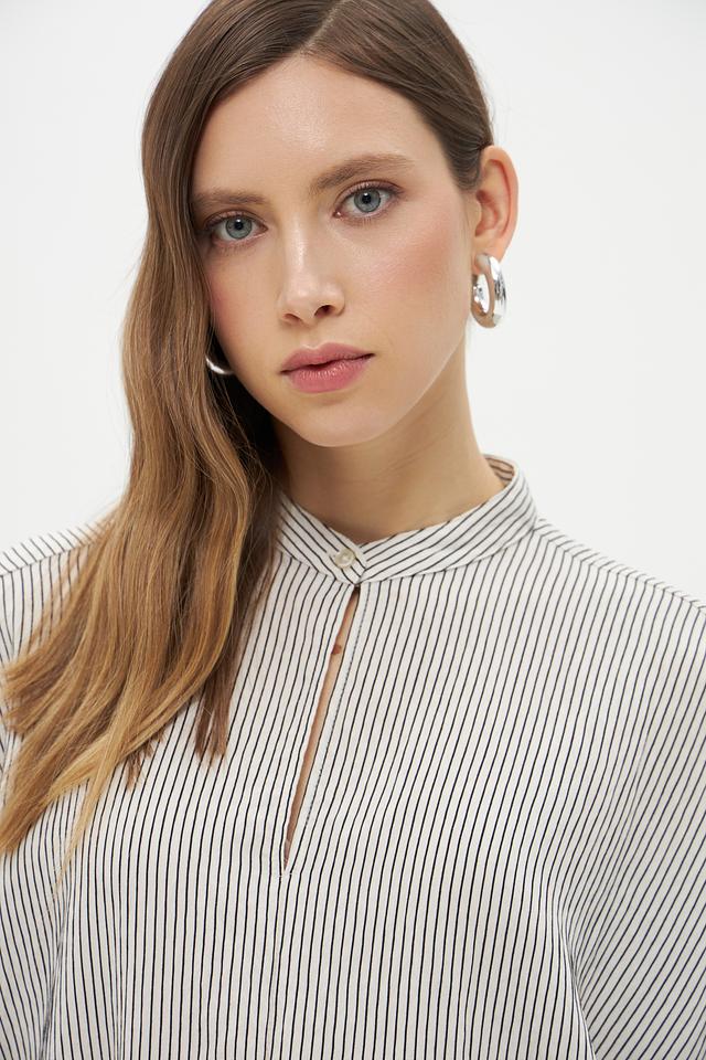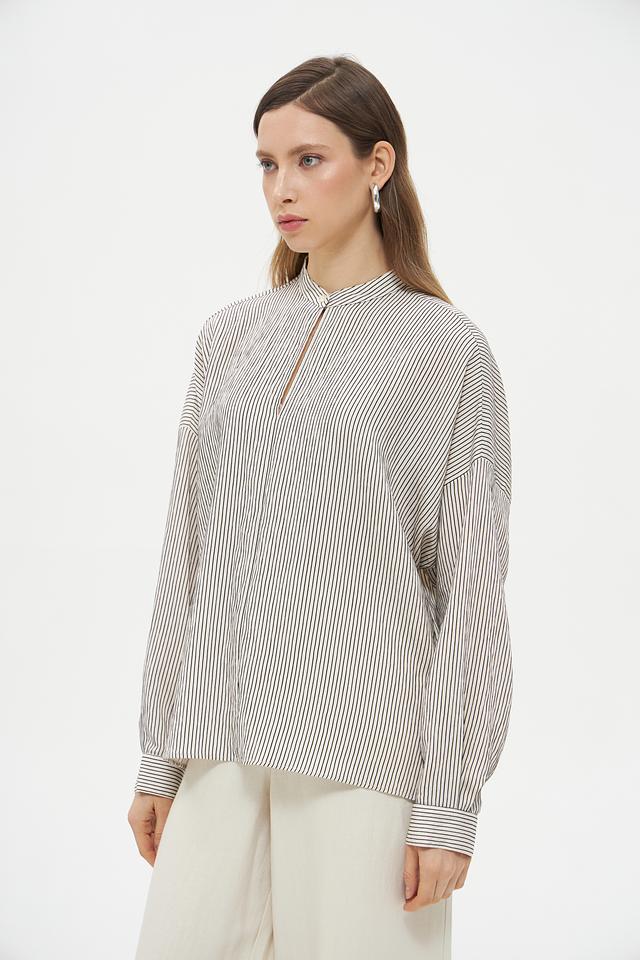 Блузка имеет классический крой с длинными рукавами-фонариками, которые придают образу романтичность и женственность. Воротник-стойка с небольшим разрезом добавляет изысканности. Вертикальная полоска черного и белого цветов визуально вытягивает силуэт и делает фигуру более стройной.