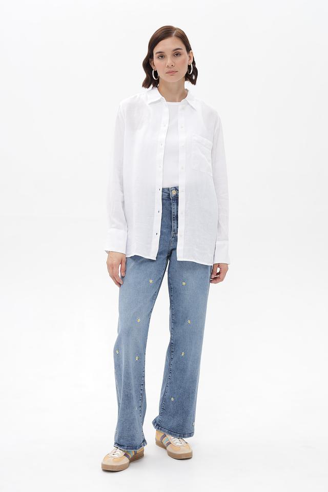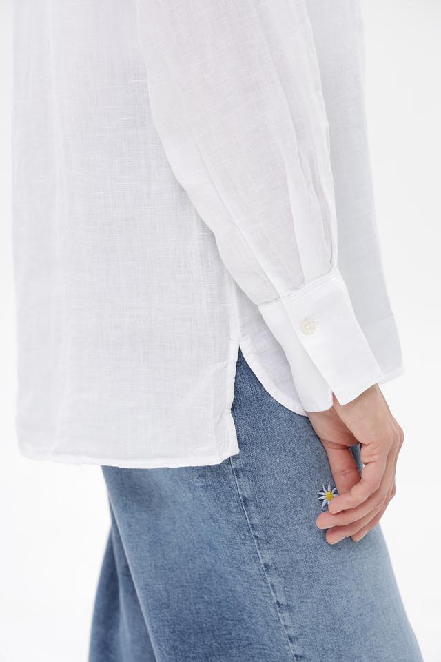 Рукава блузы длинные, с манжетами на пуговицах, что позволяет регулировать их длину. Благодаря своему минималистичному дизайну, эта блуза легко сочетается с различными элементами гардероба – от джинсов и брюк до юбок и шорт. Она станет незаменимой вещью в вашем летнем гардеробе.