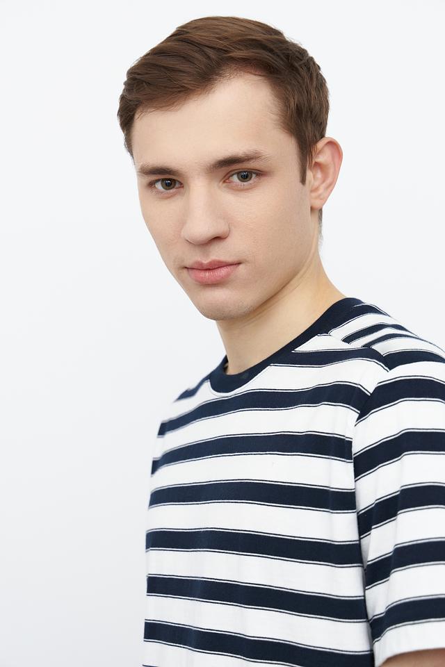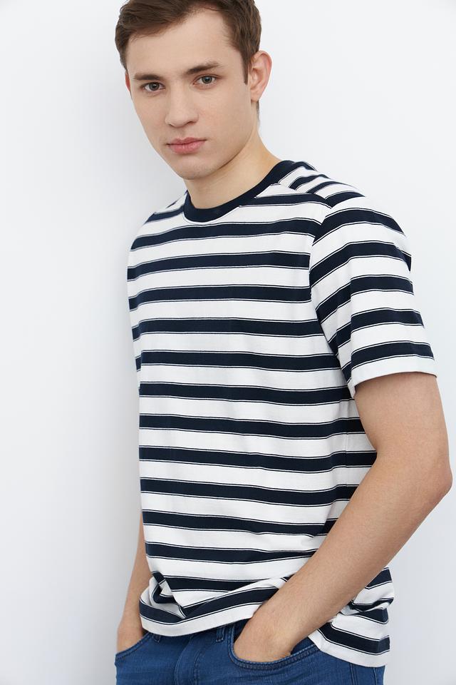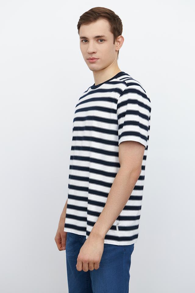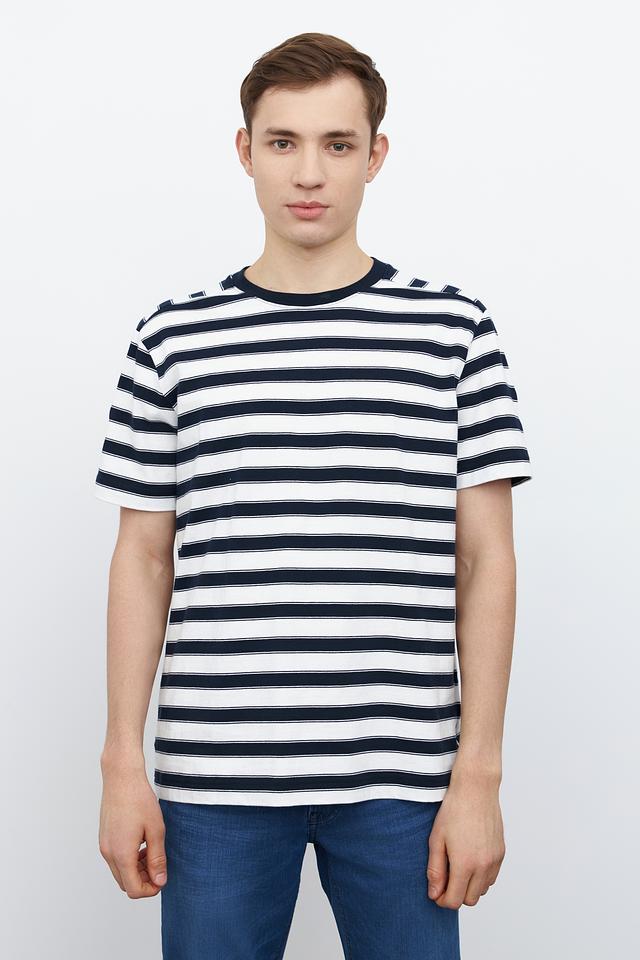Мужская футболка Marc O Polo синего и белого цвета в классическую полоску. Изготовлена из 100% хлопка, обеспечивающего комфорт и воздухопроницаемость. Стильный и универсальный вариант для повседневного гардероба. Состав: хлопок 100%