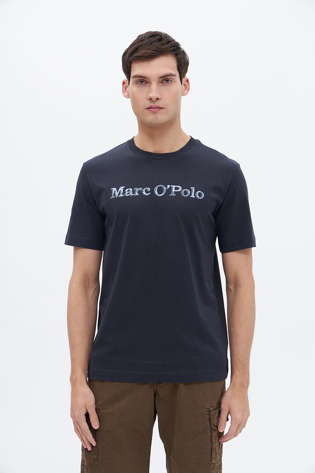 Основной цвет футболки – navy, глубокий и насыщенный оттенок синего. На груди расположен логотип Marc O Polo, выполненный в светлых тонах, что добавляет модели узнаваемость и стиль.