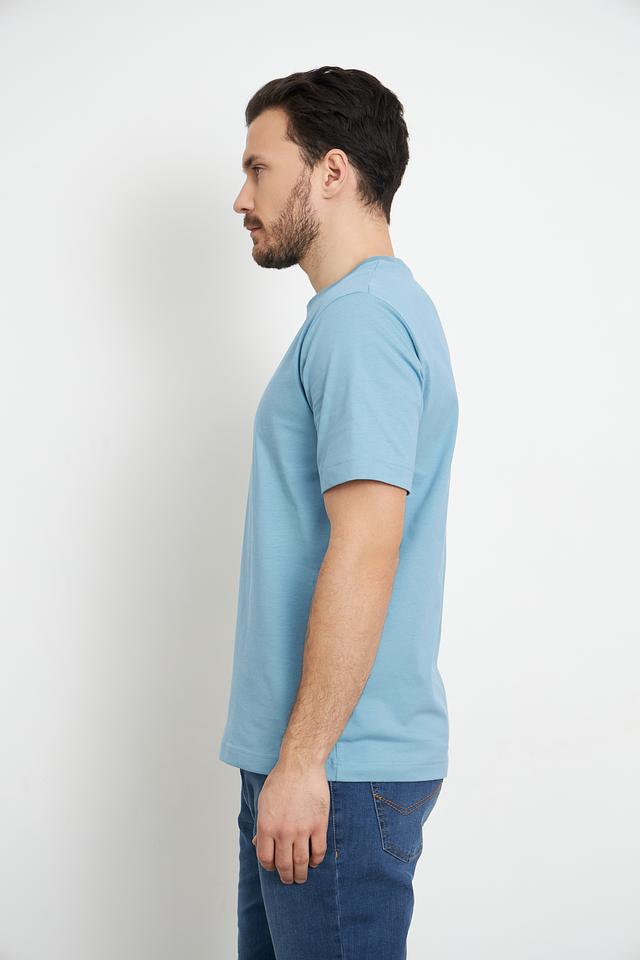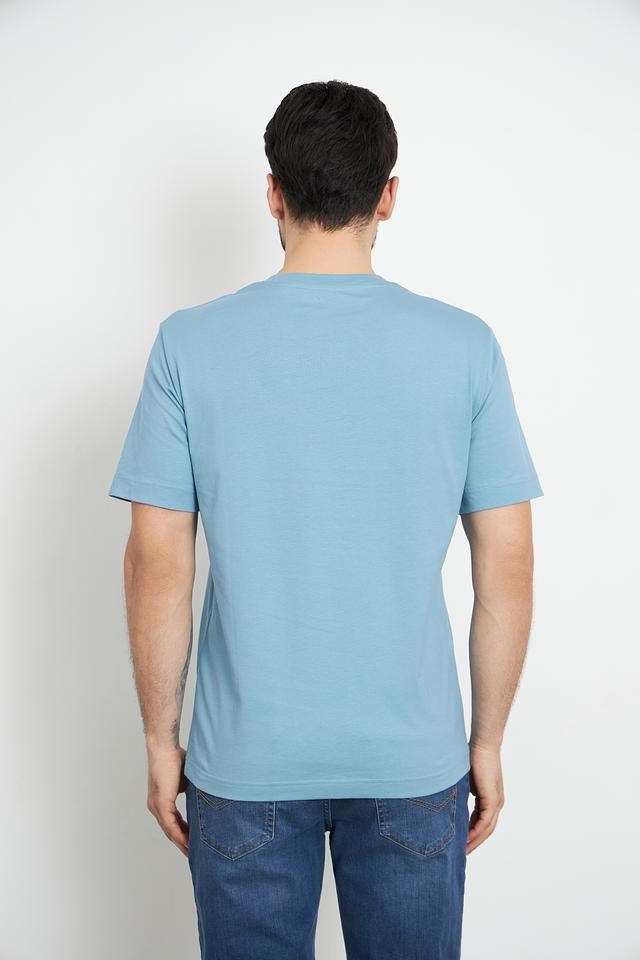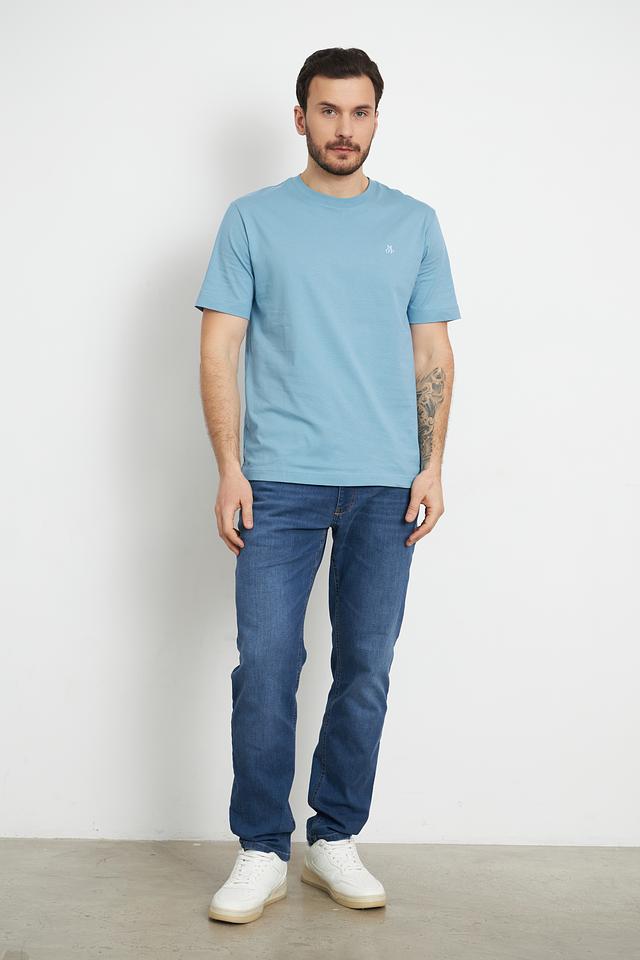 На груди располагается небольшой логотип бренда, выполненный в тон ткани. Футболка имеет однотонный голубой цвет, который легко сочетается с различными элементами гардероба.