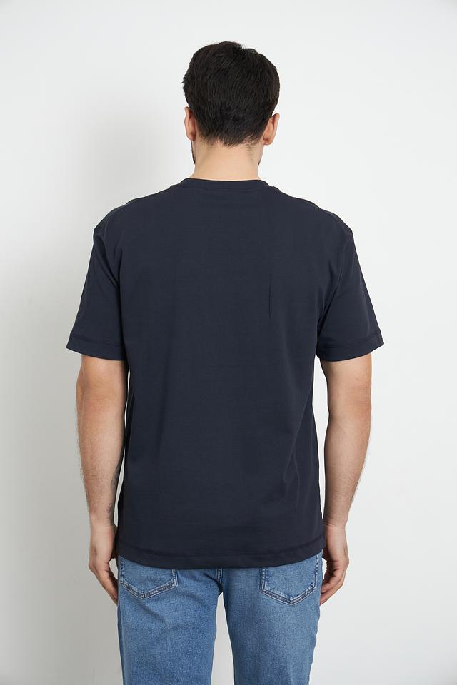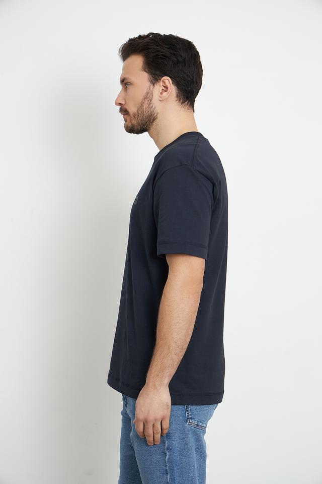 Цвет футболки – насыщенный тёмно-синий, который легко сочетается с различными элементами гардероба. На груди располагается небольшая, едва заметная эмблема бренда, выполненная в тон ткани. Такой минималистичный дизайн делает футболку универсальной и подходящей для создания различных образов.
