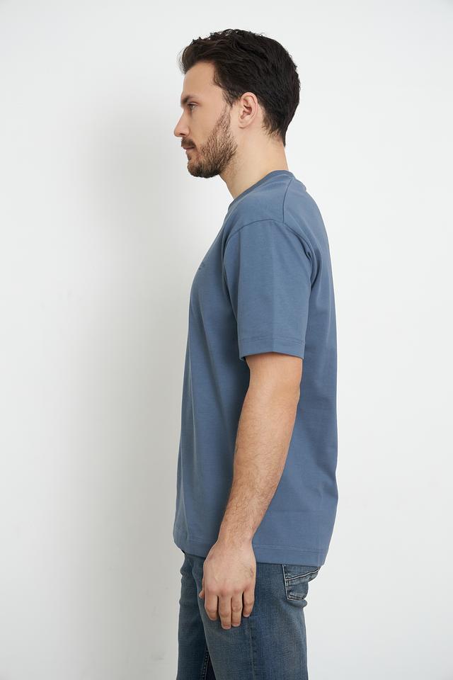 Модель имеет прямой крой, который обеспечивает свободу движений и подходит для различных типов фигур. Цвет футболки – приглушенный голубой, который легко сочетается с другими элементами гардероба.