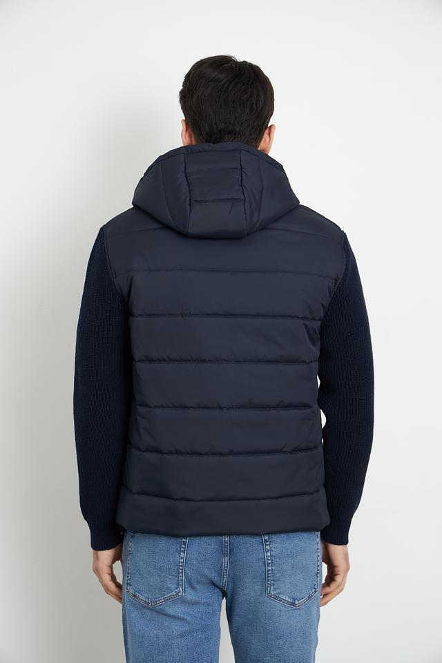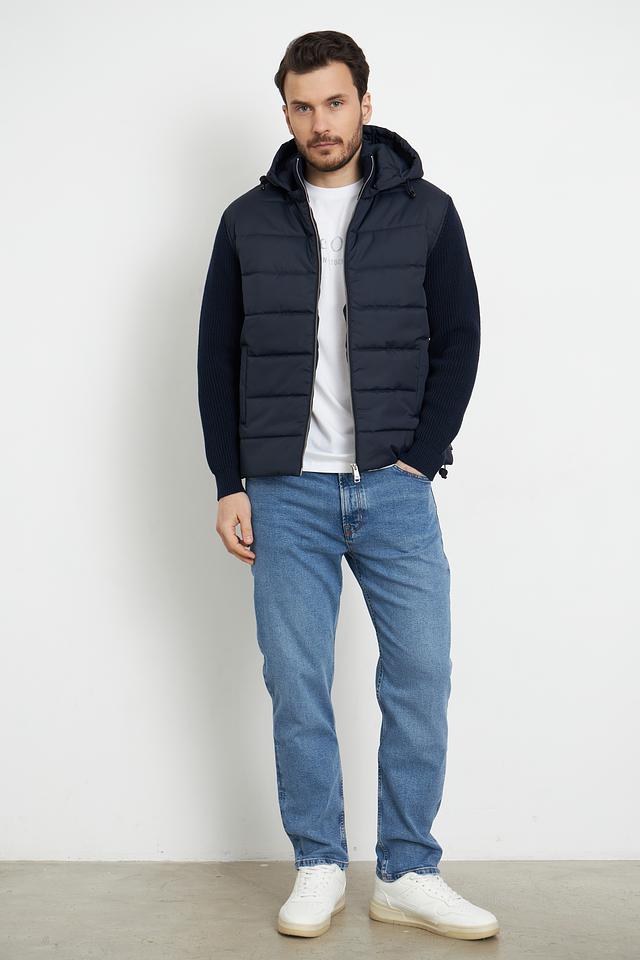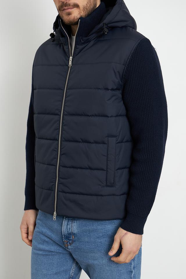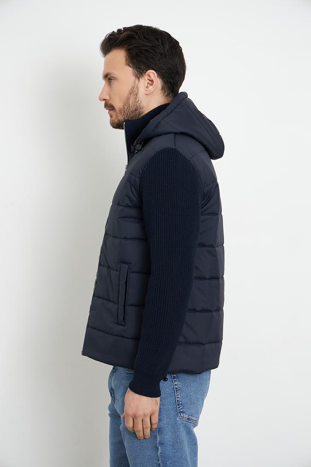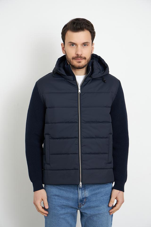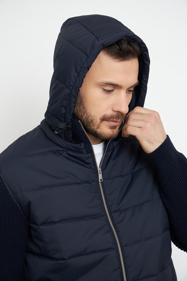 Рукава куртки выполнены из плотного трикотажа, также тёмно-синего оттенка, что создает интересный контраст текстур и добавляет комфорта при носке. Куртка застегивается на молнию, имеет капюшон и два боковых кармана.