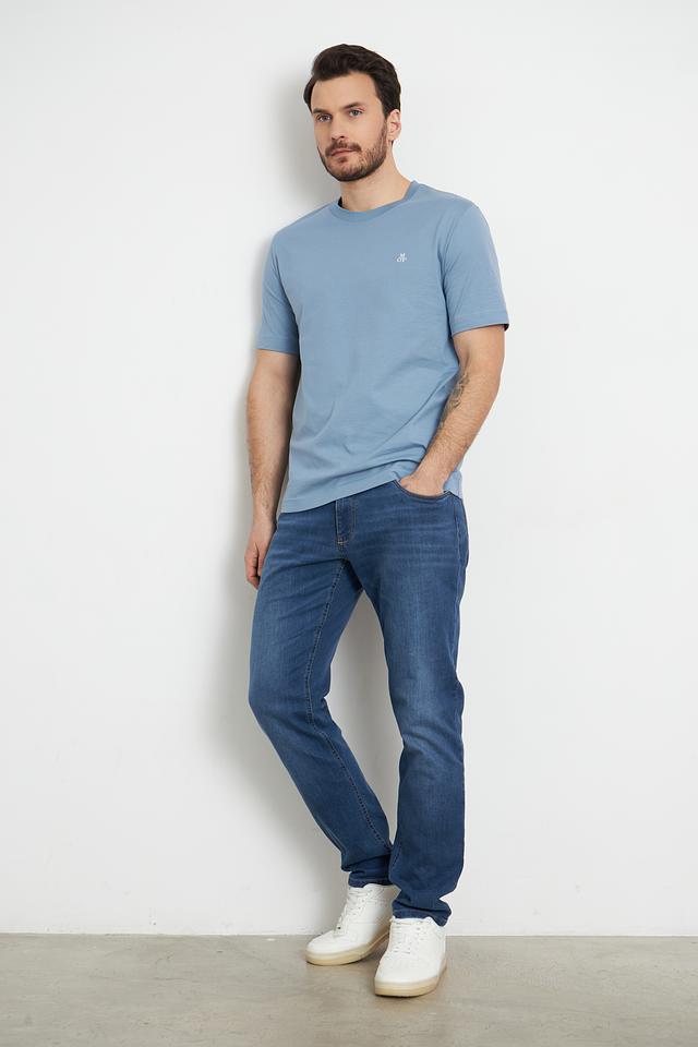 Футболка имеет короткий рукав и круглый вырез горловины. На груди расположен небольшой логотип бренда, выполненный в тон ткани, что придает изделию лаконичный и стильный вид. Цвет футболки – приглушенный голубой, который легко сочетается с различными элементами гардероба.